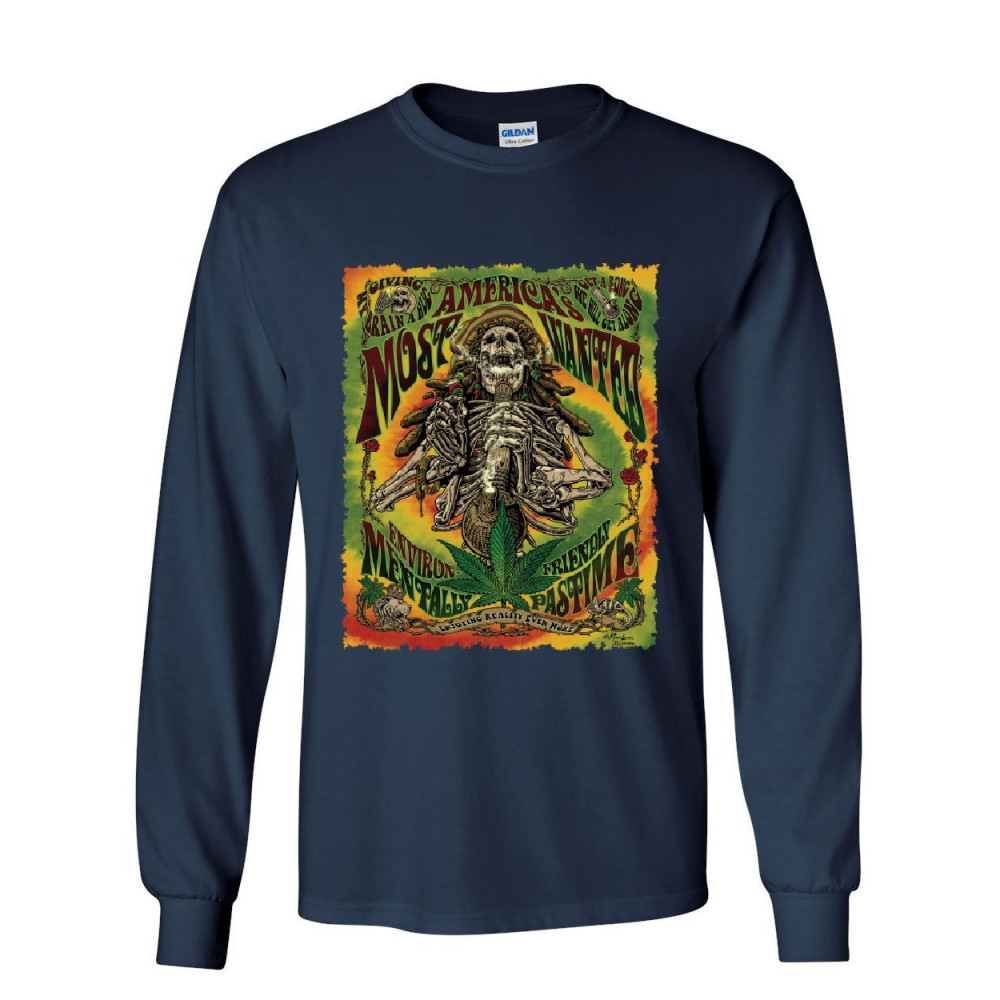 AMERICA'S MOST WANTED long sleeve t-shirt 420 smoking weed marijuana rasta tee navy blue