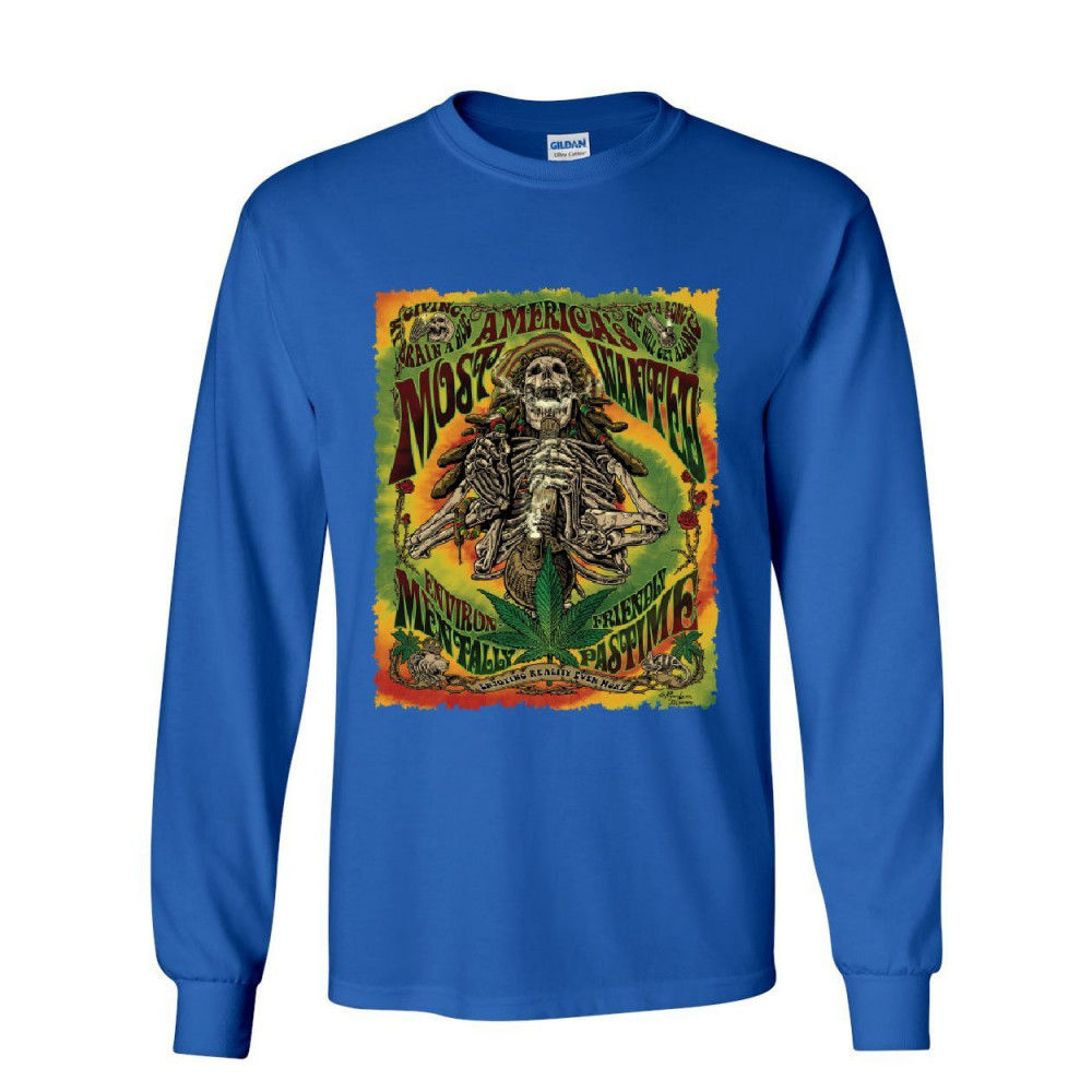 AMERICA'S MOST WANTED long sleeve t-shirt 420 smoking weed marijuana rasta tee royal blue
