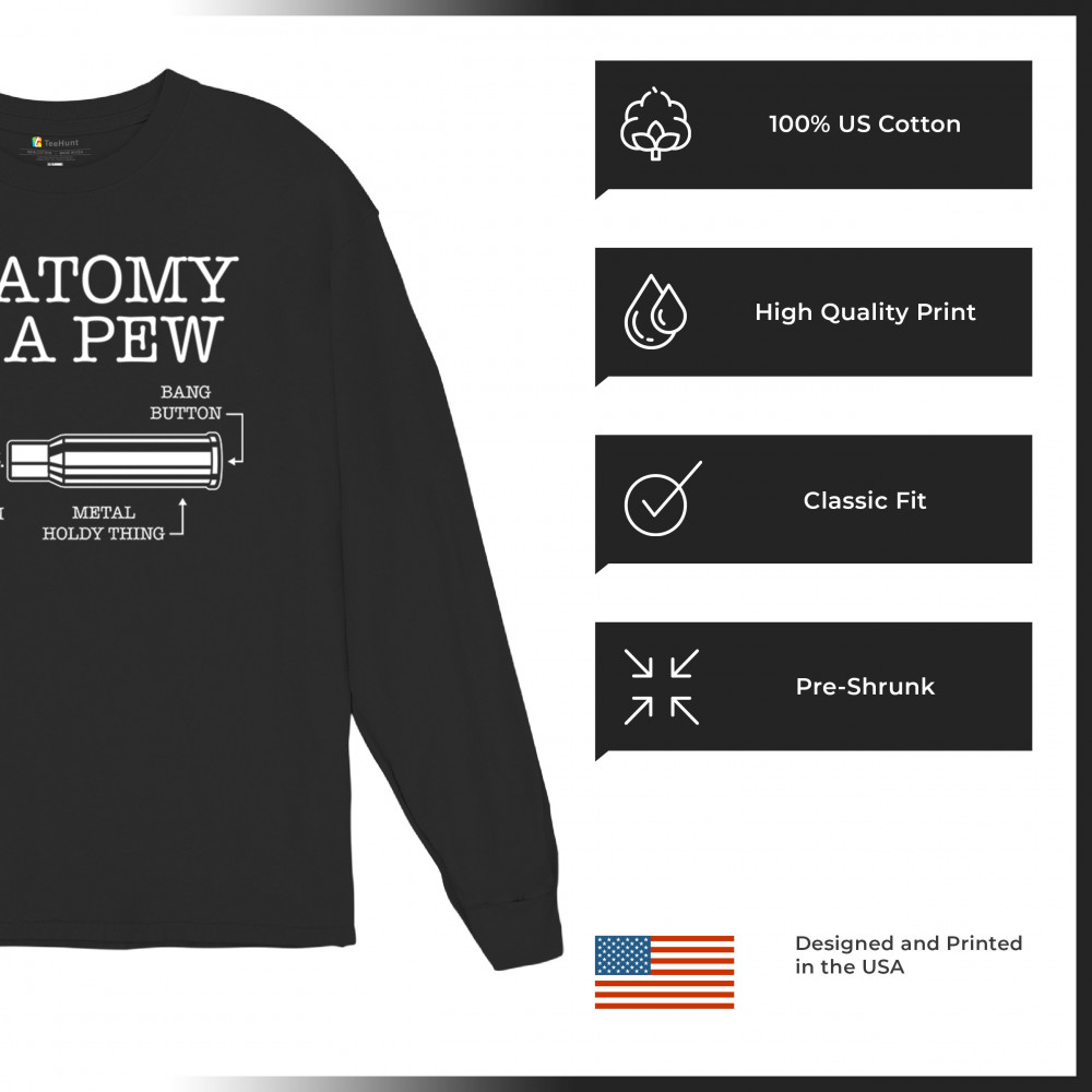 Show off your 'Anatomy of a Pew' tee, blending humor with the pride of the 4th Amendment and the spirit of the militia.