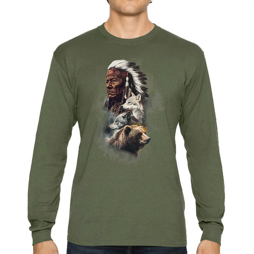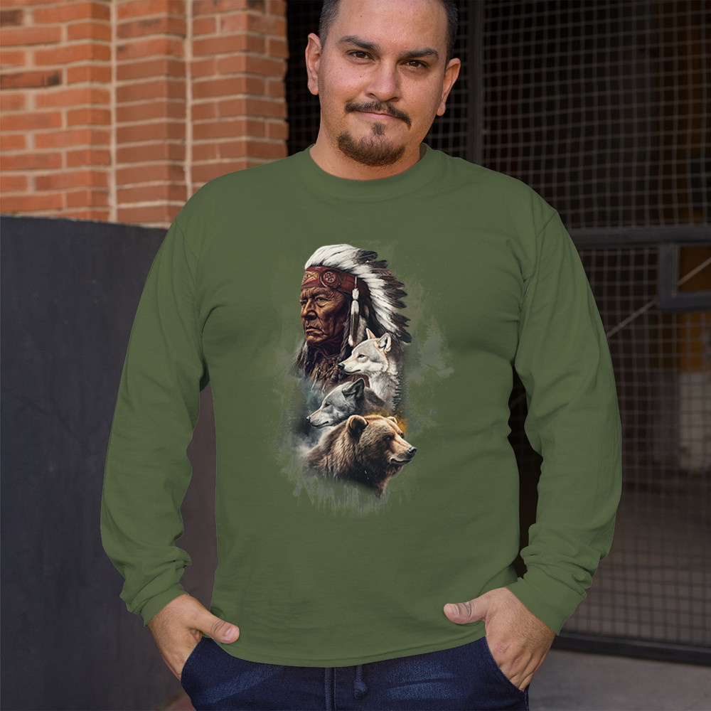 Celebrate spiritual strength and heritage with this design featuring a Native American elder alongside wolves and a bear. This tribal and totemic art reflects wisdom, guardianship, and deep forest spirit energy. Perfect for cultural pride, animal lovers, and those connected to spiritual symbolism in nature.