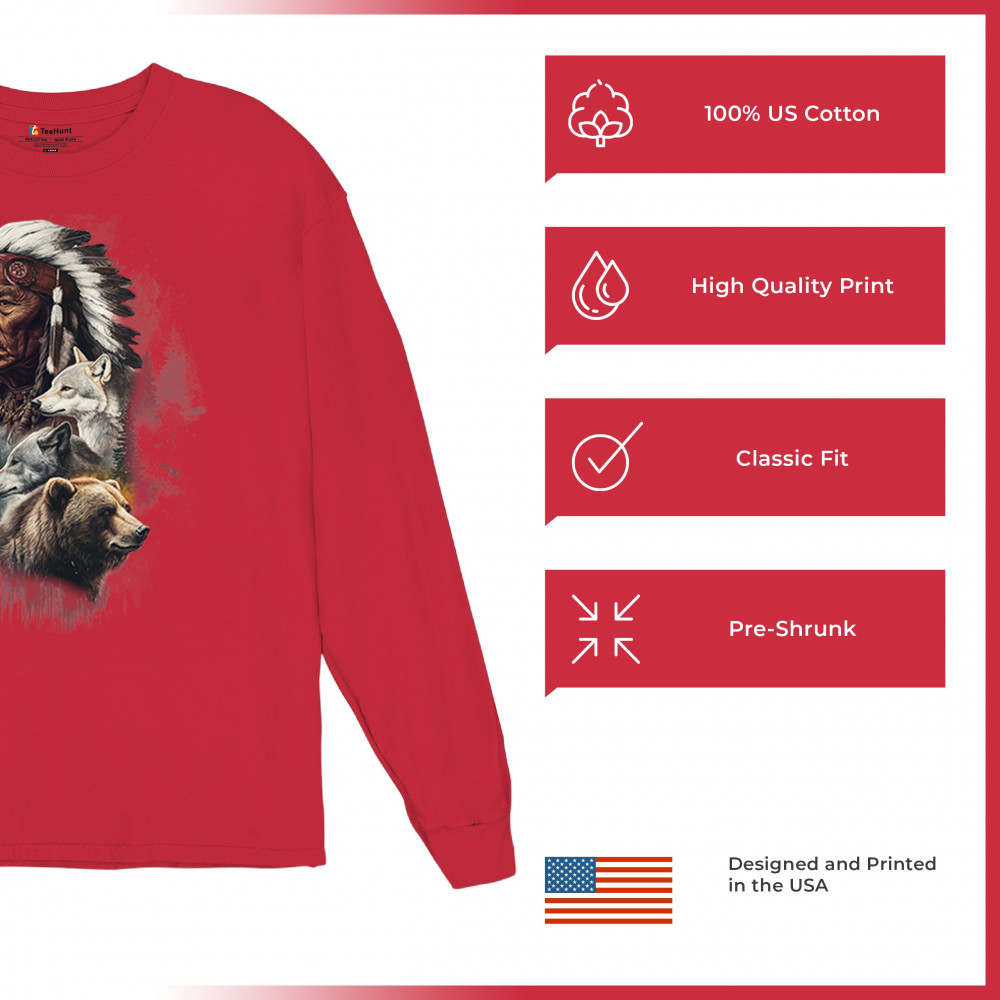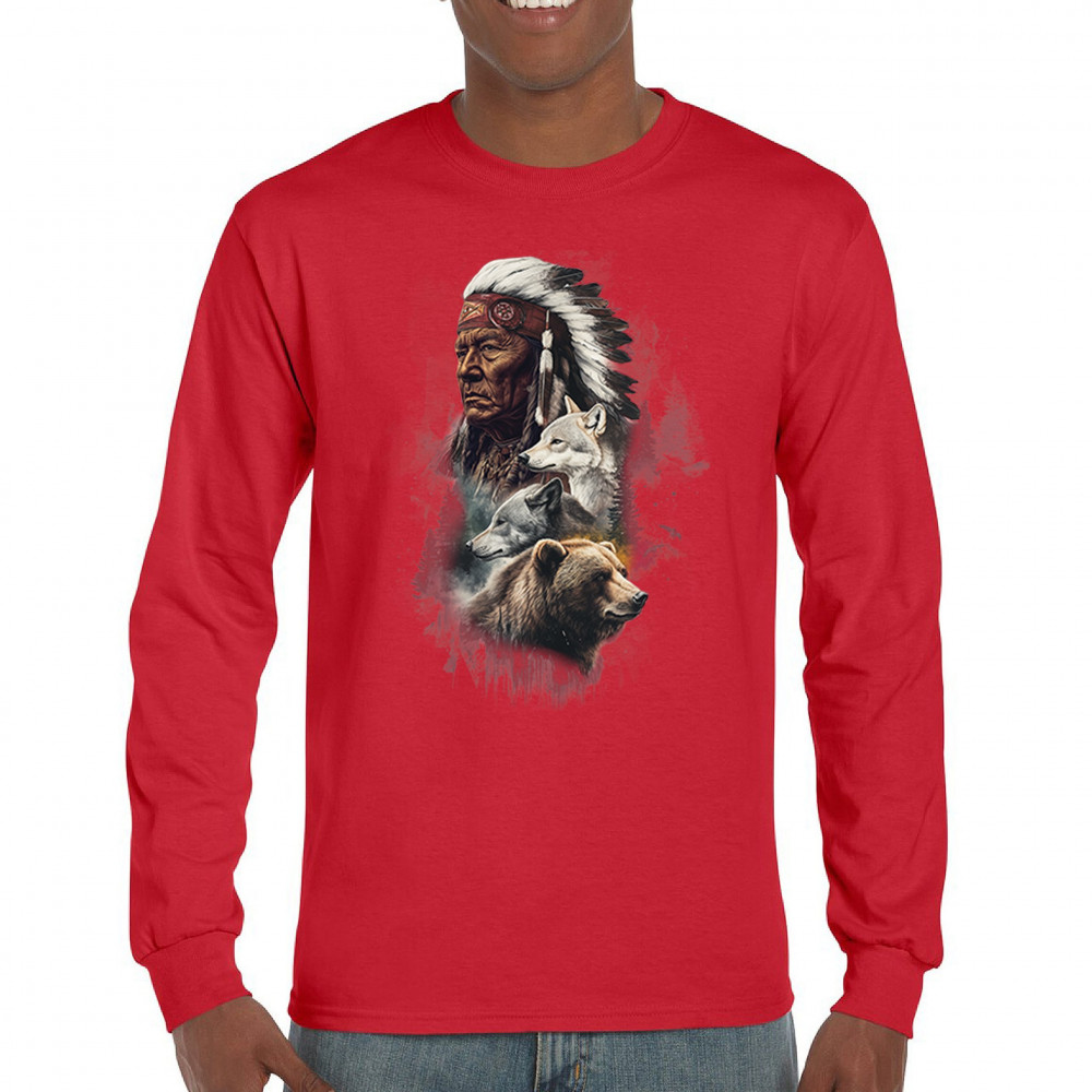 Celebrate spiritual strength and heritage with this design featuring a Native American elder alongside wolves and a bear. This tribal and totemic art reflects wisdom, guardianship, and deep forest spirit energy. Perfect for cultural pride, animal lovers, and those connected to spiritual symbolism in nature.