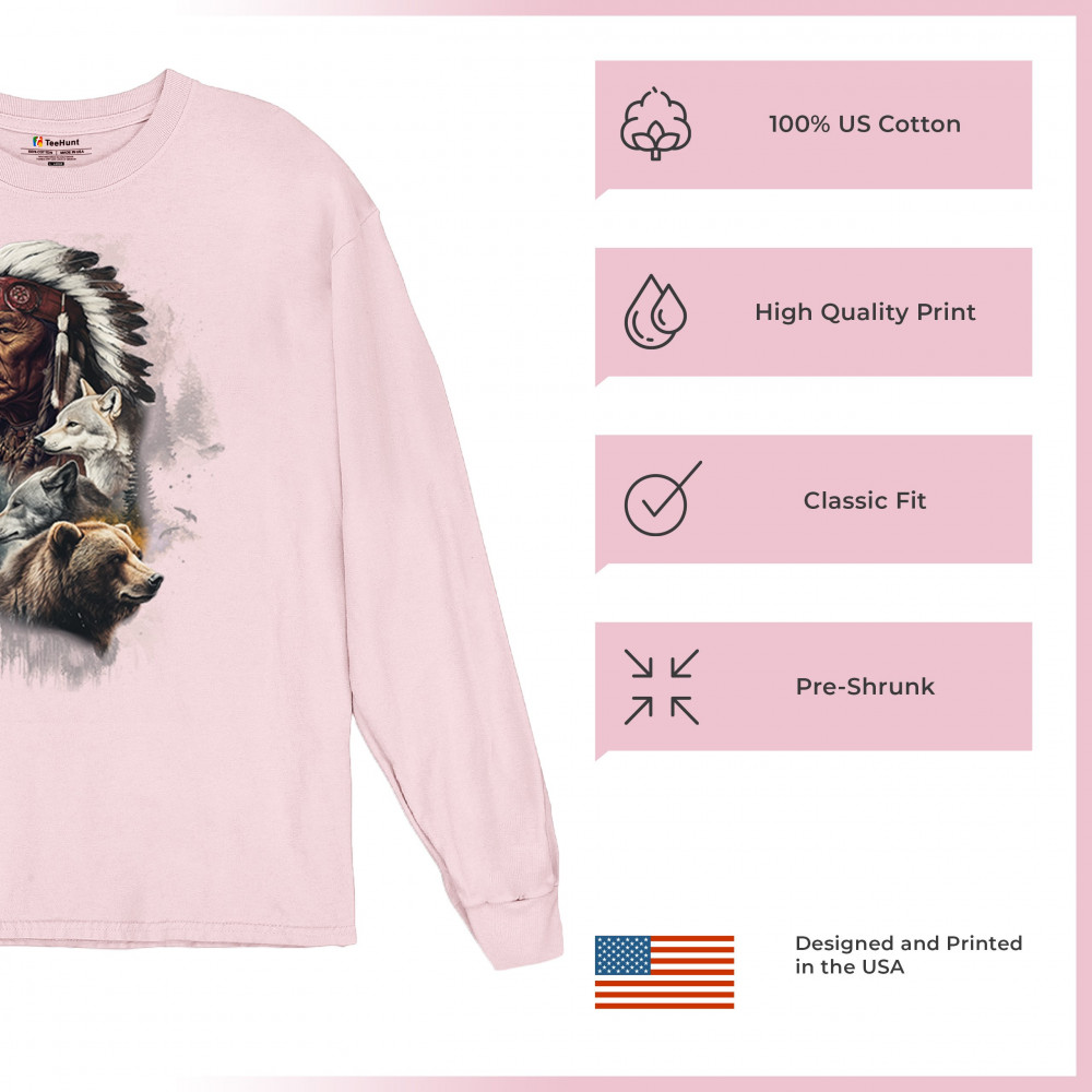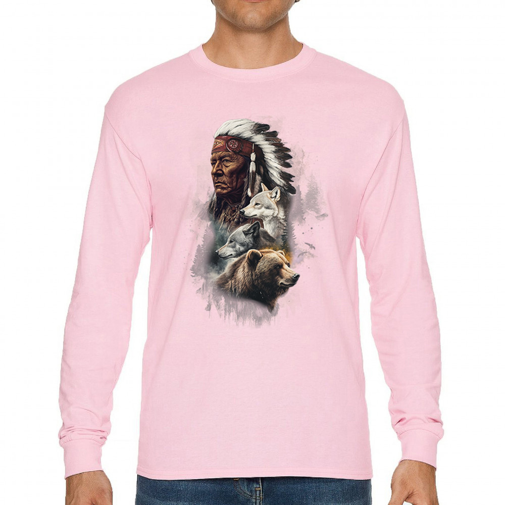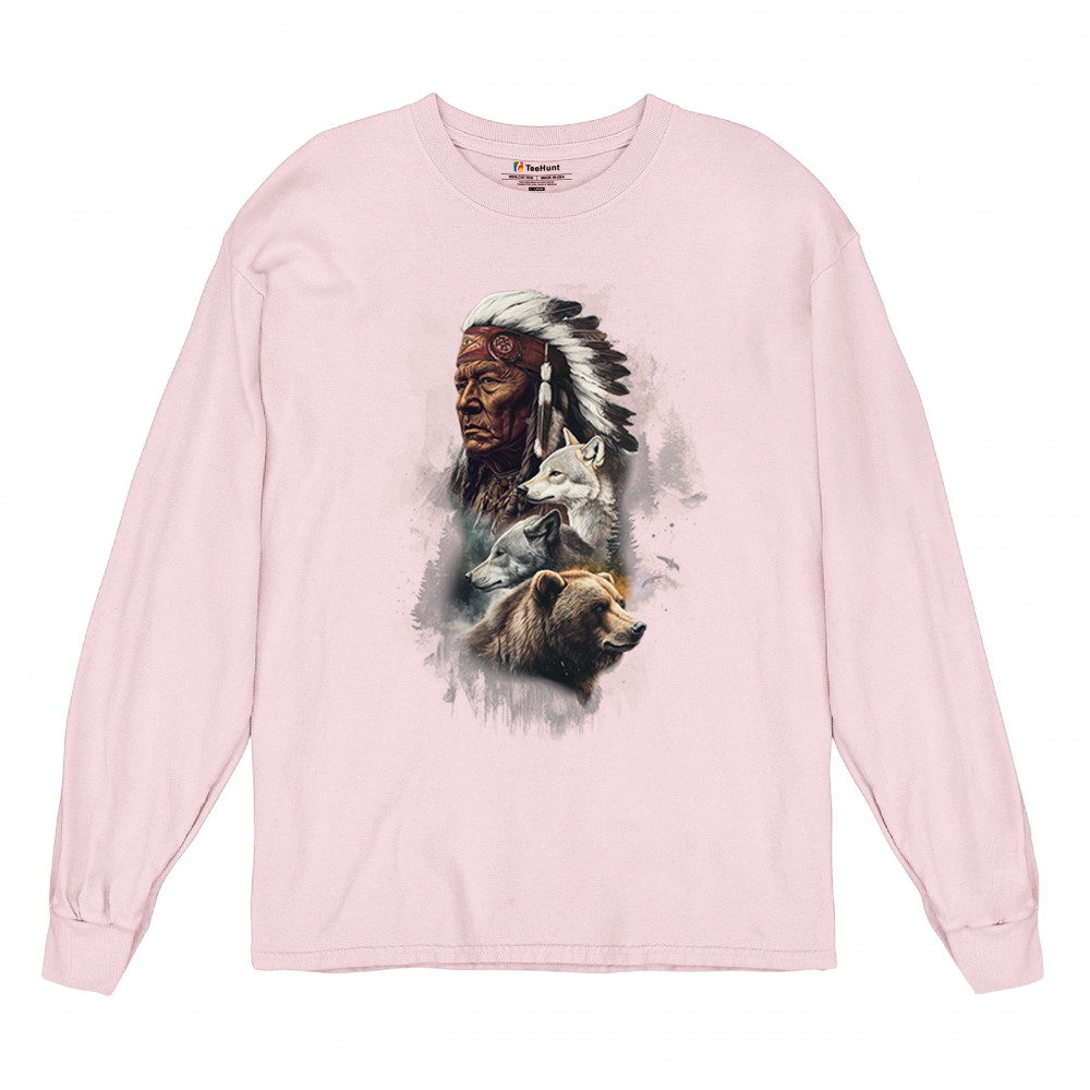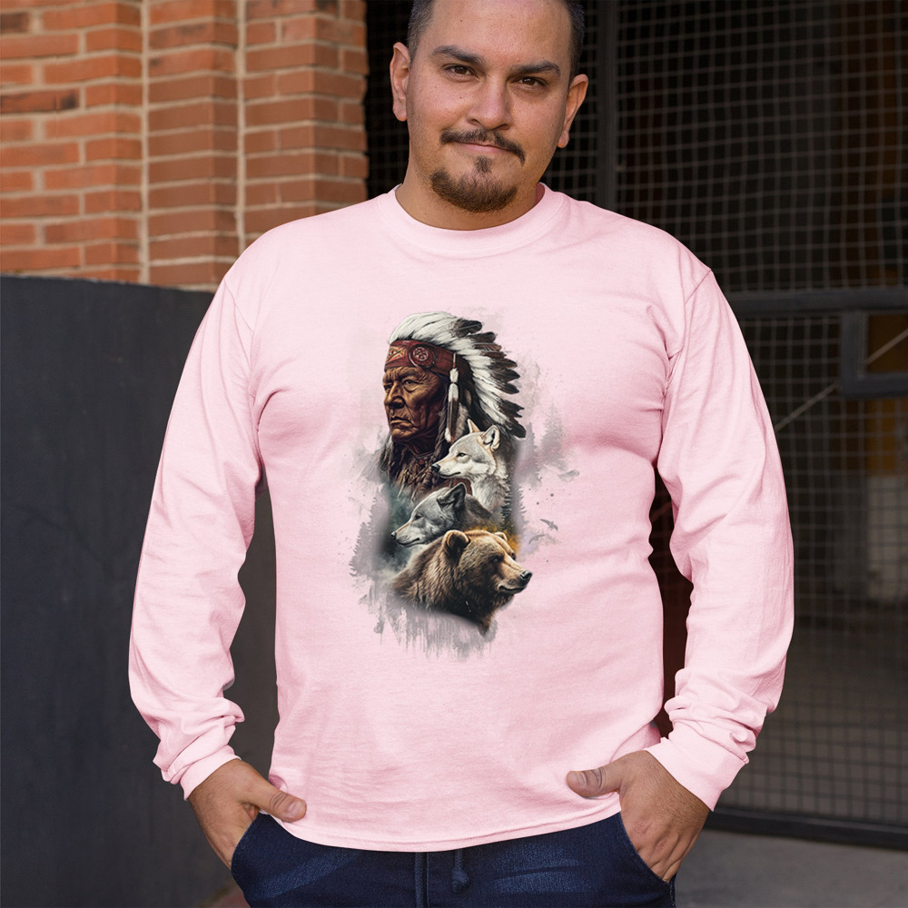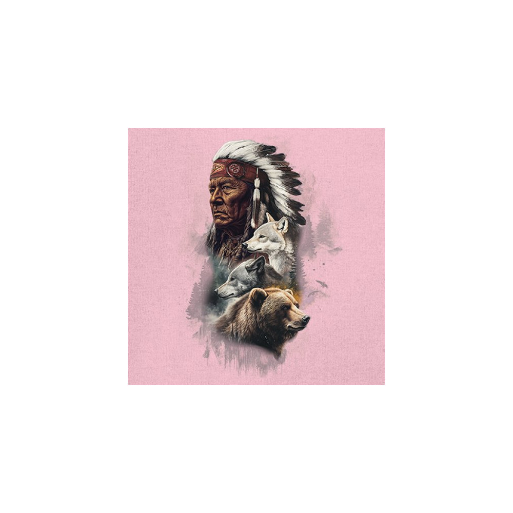 Celebrate spiritual strength and heritage with this design featuring a Native American elder alongside wolves and a bear. This tribal and totemic art reflects wisdom, guardianship, and deep forest spirit energy. Perfect for cultural pride, animal lovers, and those connected to spiritual symbolism in nature.