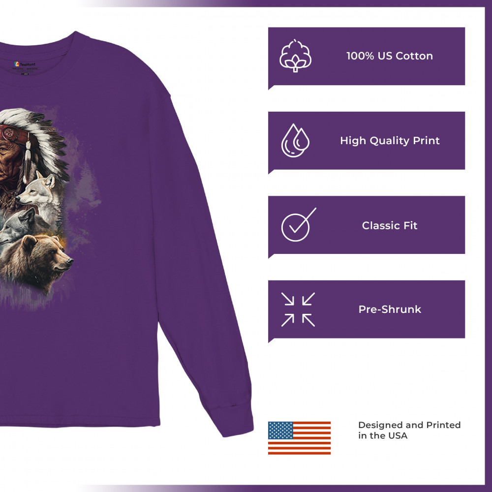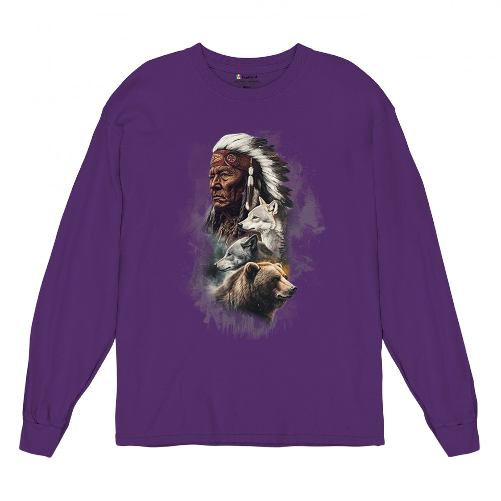 Celebrate spiritual strength and heritage with this design featuring a Native American elder alongside wolves and a bear. This tribal and totemic art reflects wisdom, guardianship, and deep forest spirit energy. Perfect for cultural pride, animal lovers, and those connected to spiritual symbolism in nature.