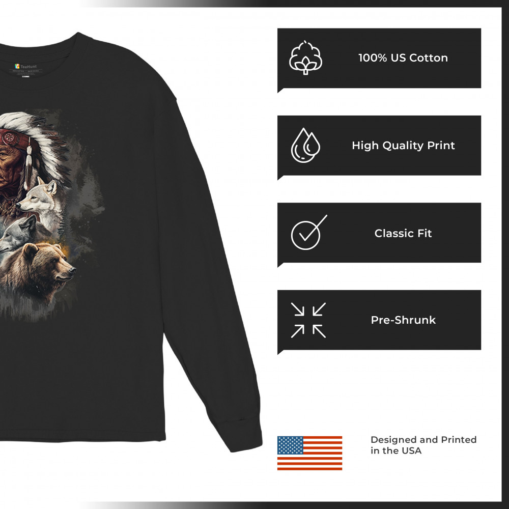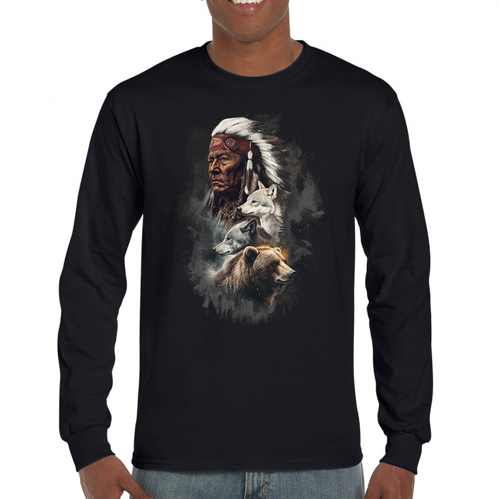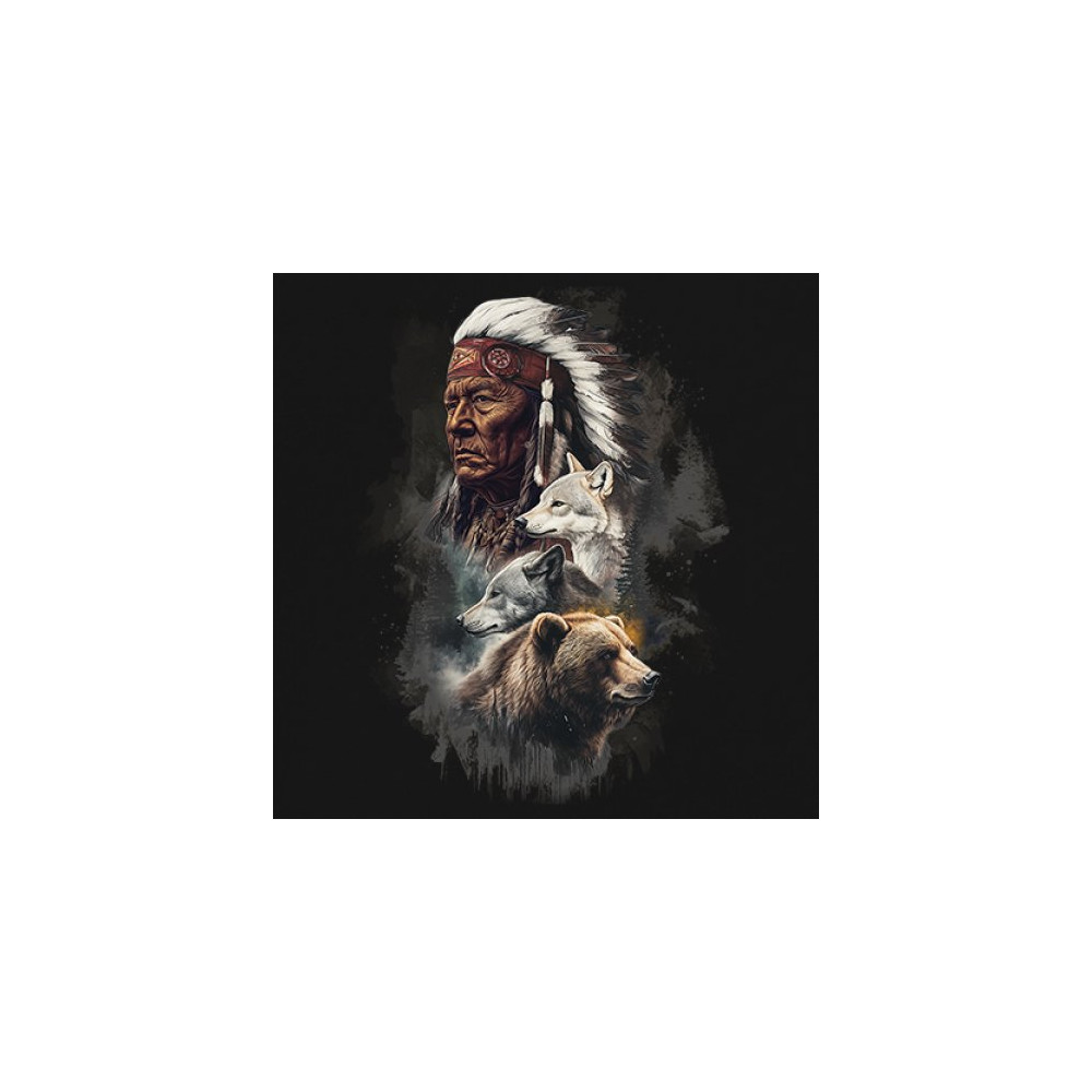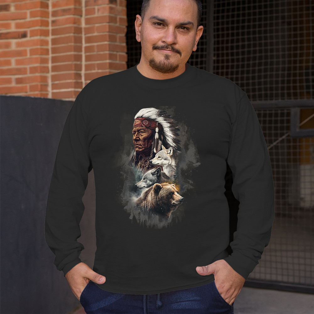 Celebrate spiritual strength and heritage with this design featuring a Native American elder alongside wolves and a bear. This tribal and totemic art reflects wisdom, guardianship, and deep forest spirit energy. Perfect for cultural pride, animal lovers, and those connected to spiritual symbolism in nature.
