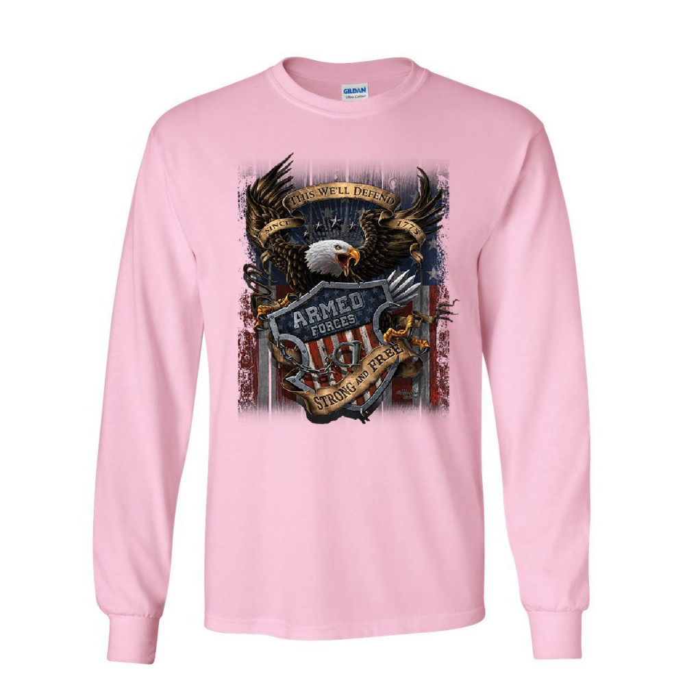 ARMED FORCES BALD EAGLE long sleeve t-shirt army this we'll defend us flag tee light pink