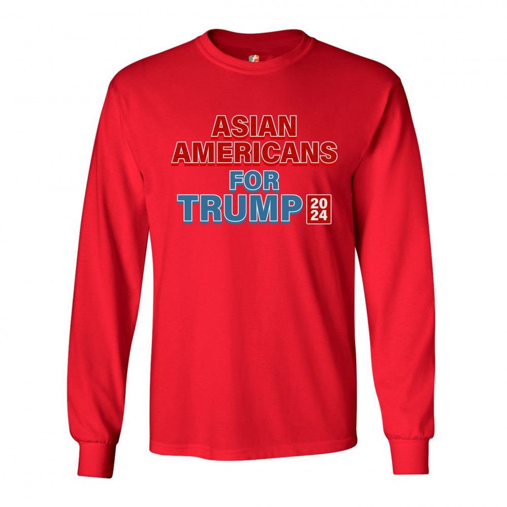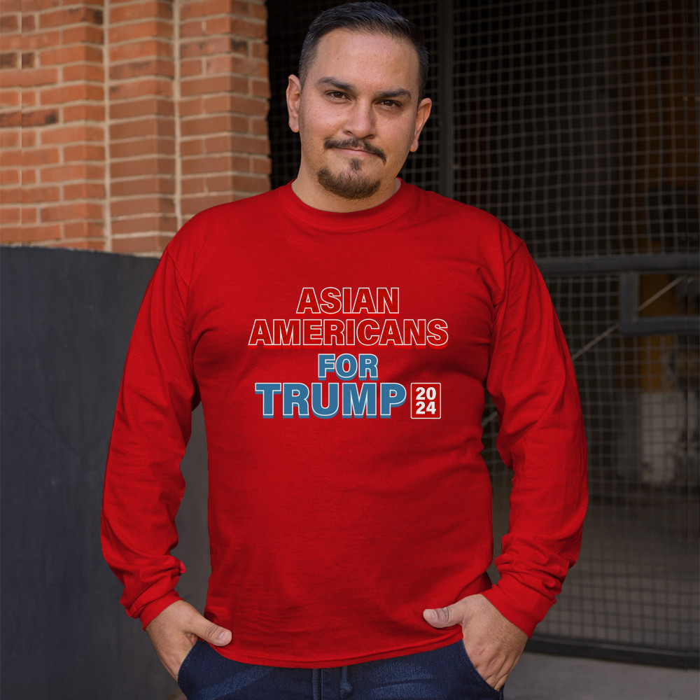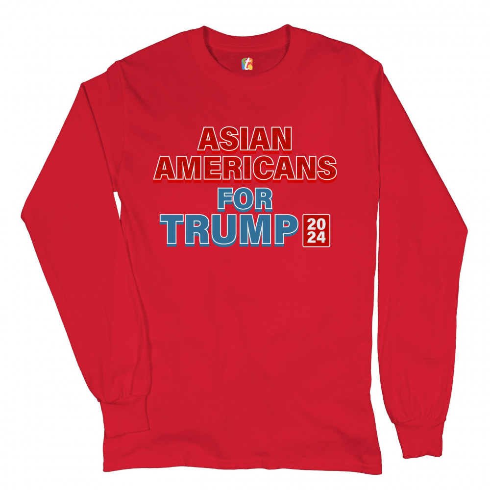 A political print saying "Asian Americans for Trump 2024". The words "Asian Americans" and the square with 2024 also have a pattern inside. A great choice to wear for a Trump rally or give as a gift to a Donald Trump supporter before 2024 presidential ele