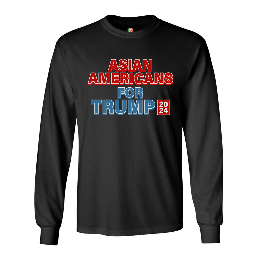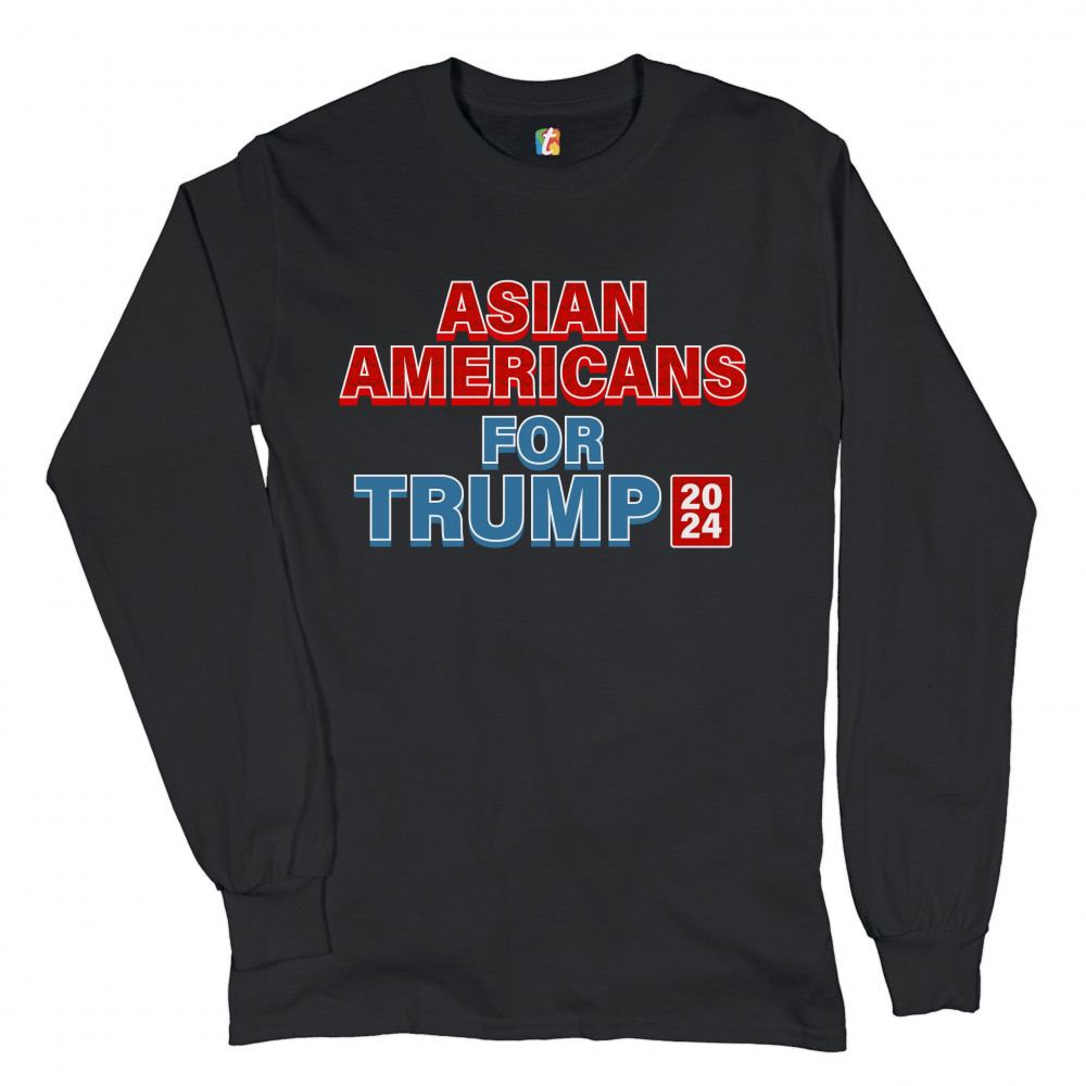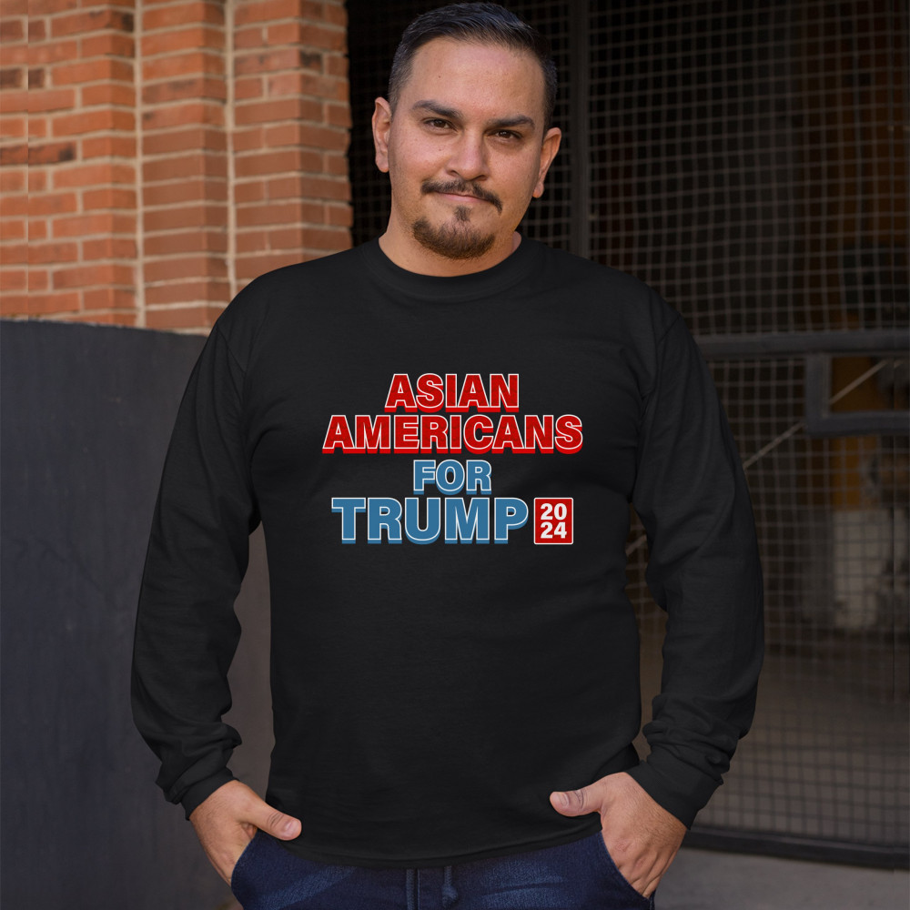 A political print saying "Asian Americans for Trump 2024". The words "Asian Americans" and the square with 2024 also have a pattern inside. A great choice to wear for a Trump rally or give as a gift to a Donald Trump supporter before 2024 presidential ele