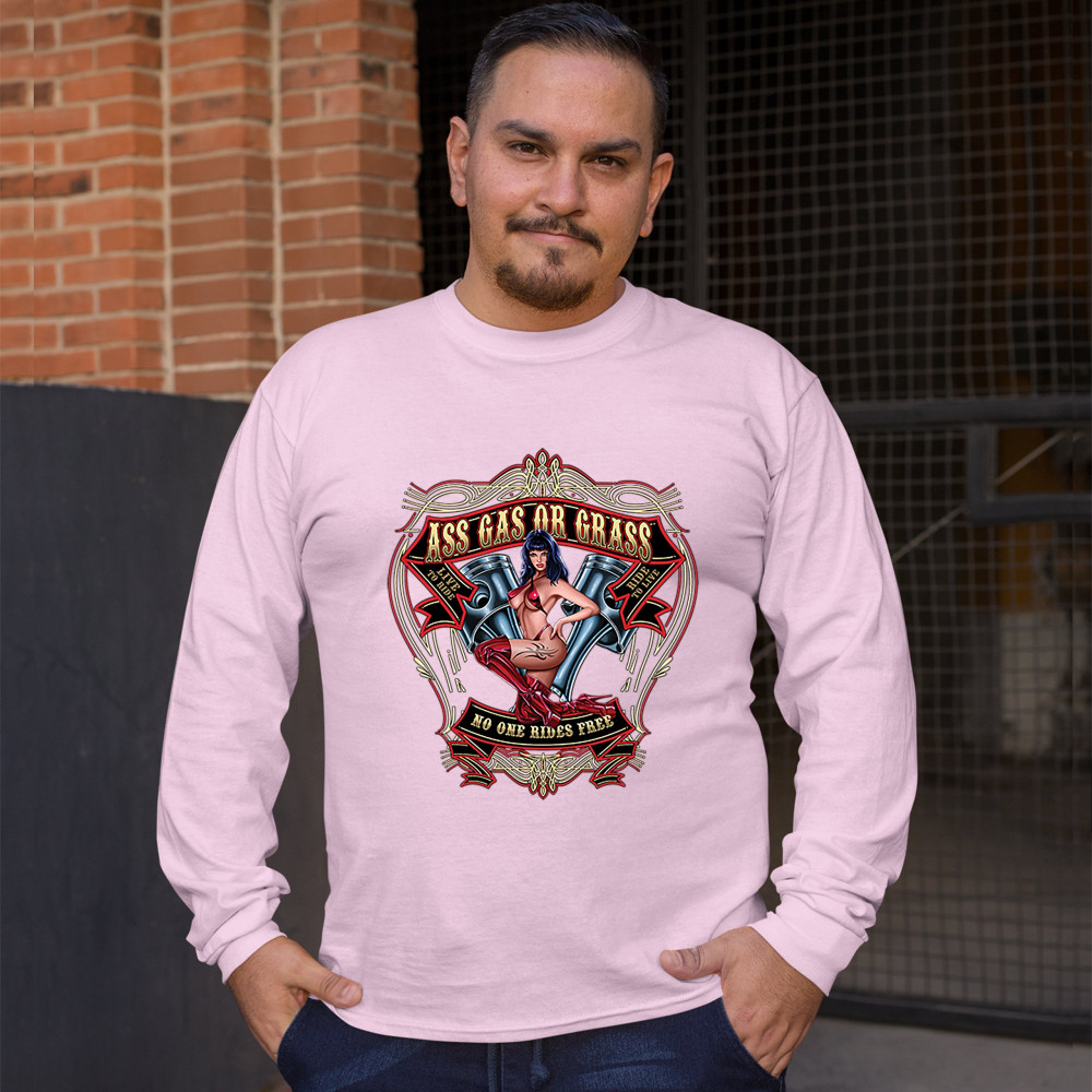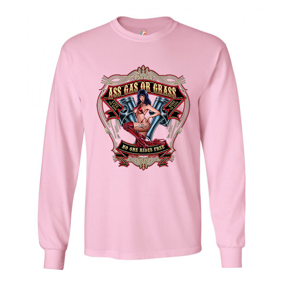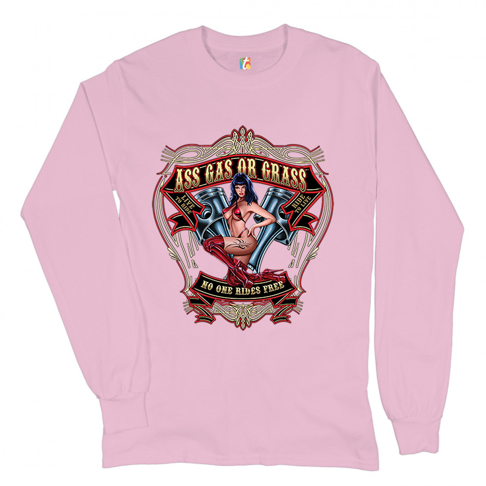 A print featuring a sexy girl in high heels. On multiple stripes or signs the print says: "Ass Gas or Grass, Live to Ride, Ride to Live, No One Rides Free". There are huge pistons in the background. A great choice for a motorcycle enthusiast.