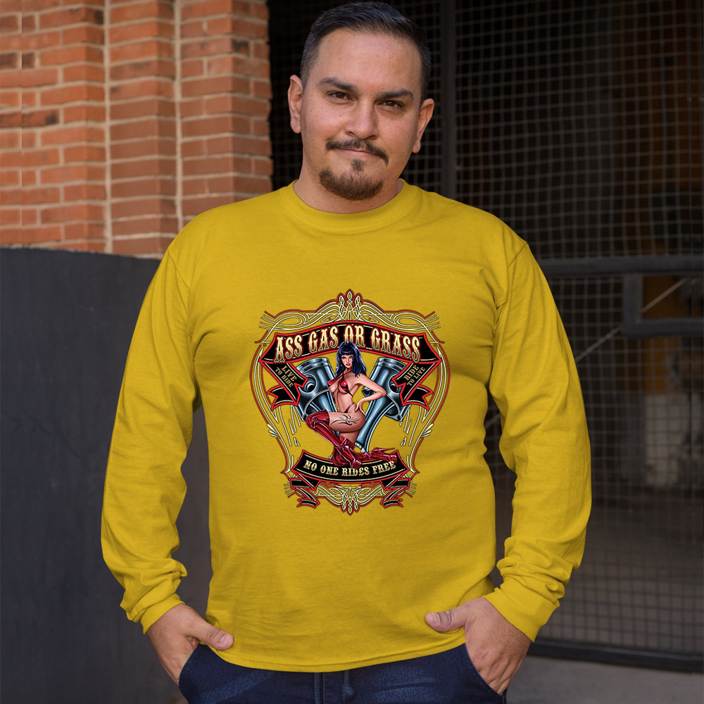 ASS GAS OR GRASS long sleeve t-shirt biker no one rides free live to ride yellow