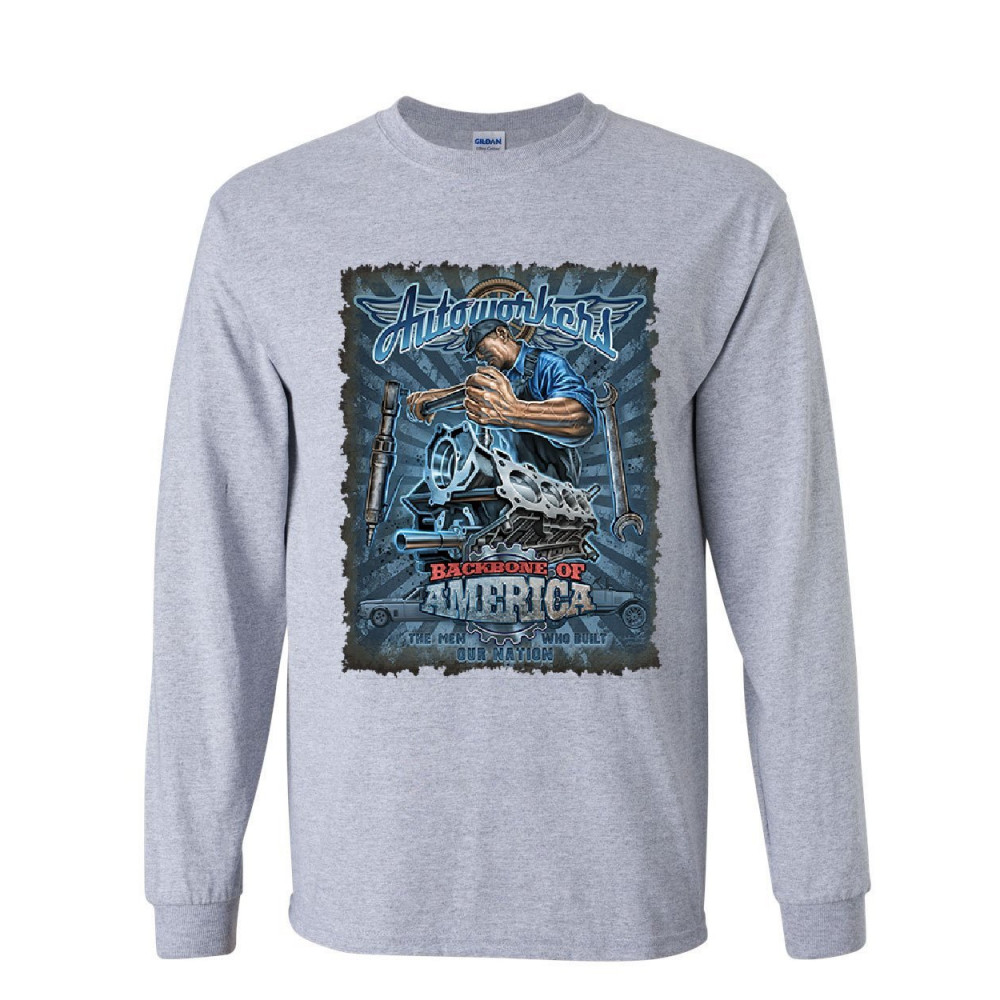 AUTOWORKERS - BACKBONE OF AMERICA autoworkers backbone of america long sleeve t-shirt car motor mechanic union tee gray