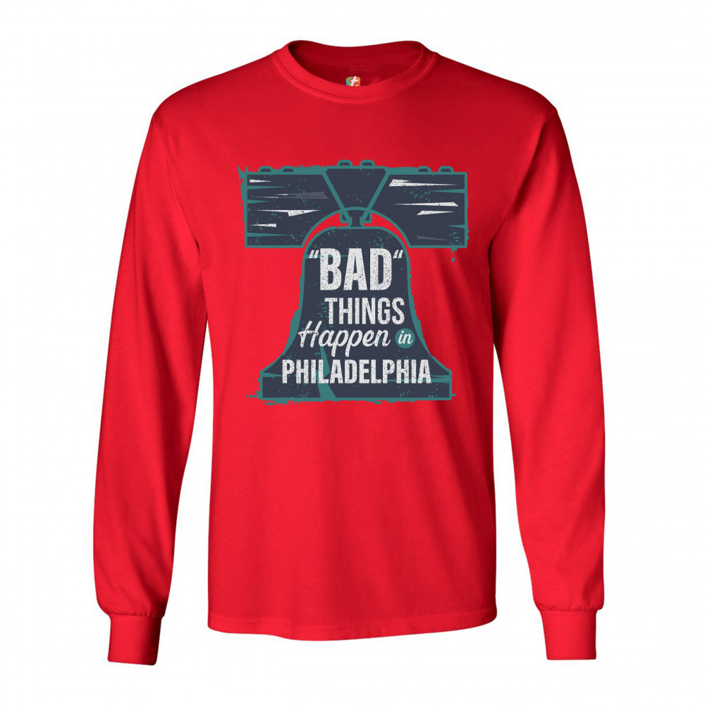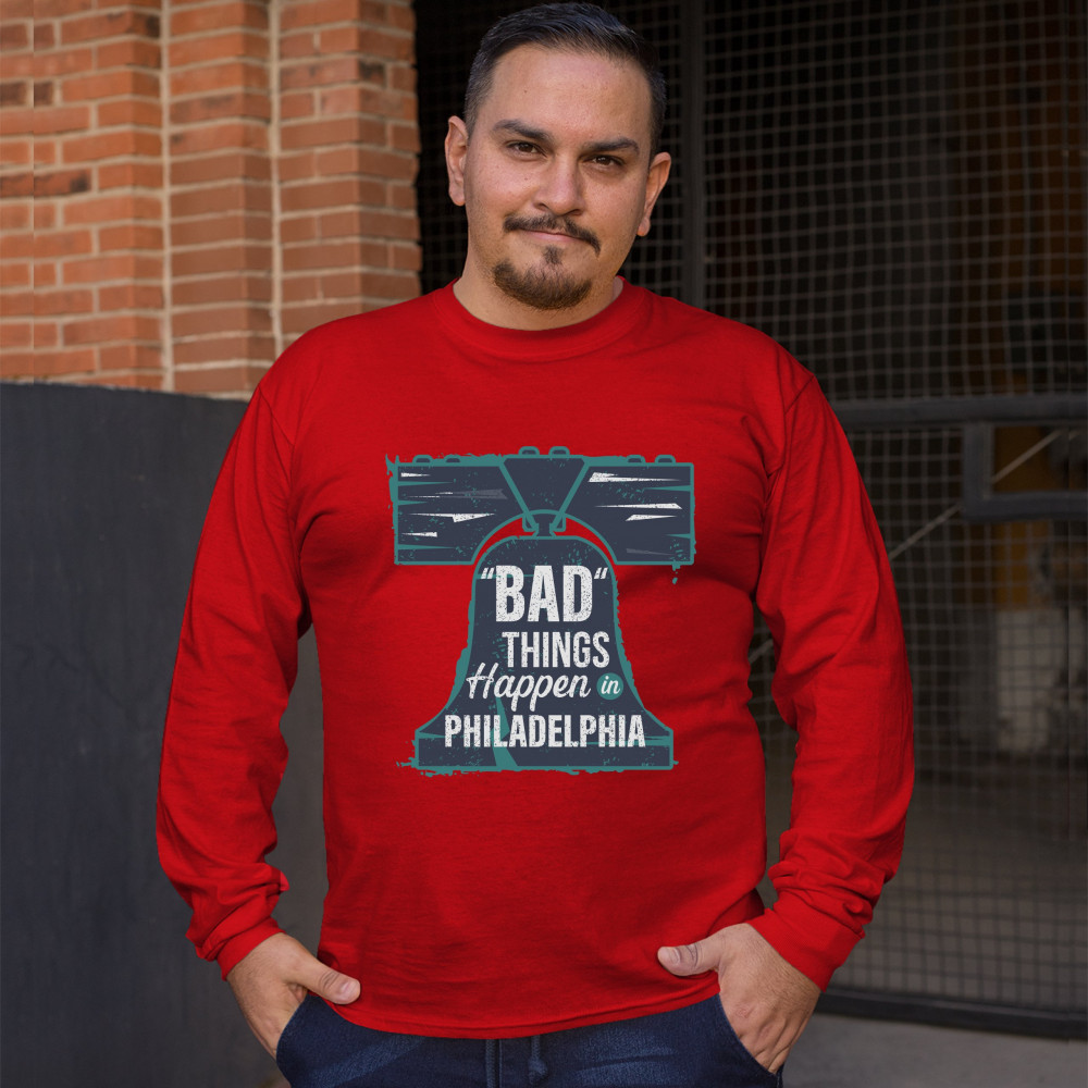 A funny print featuring the famous Liberty Bell located in Philadelphia, Pennsylvania. On the Bell it is written: "Bad things happen in Philadelphia". The word "bad" is in air quotes. It is a great choice for anyone who closely follows politics.