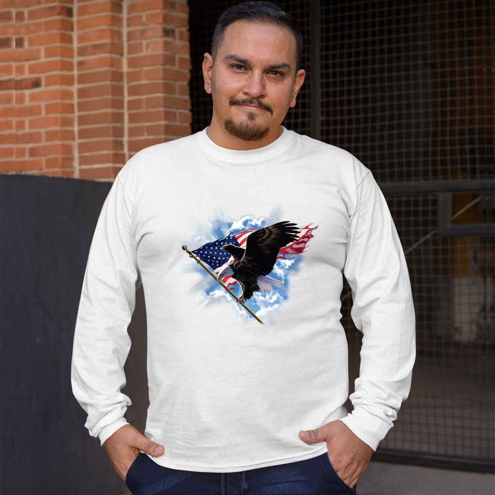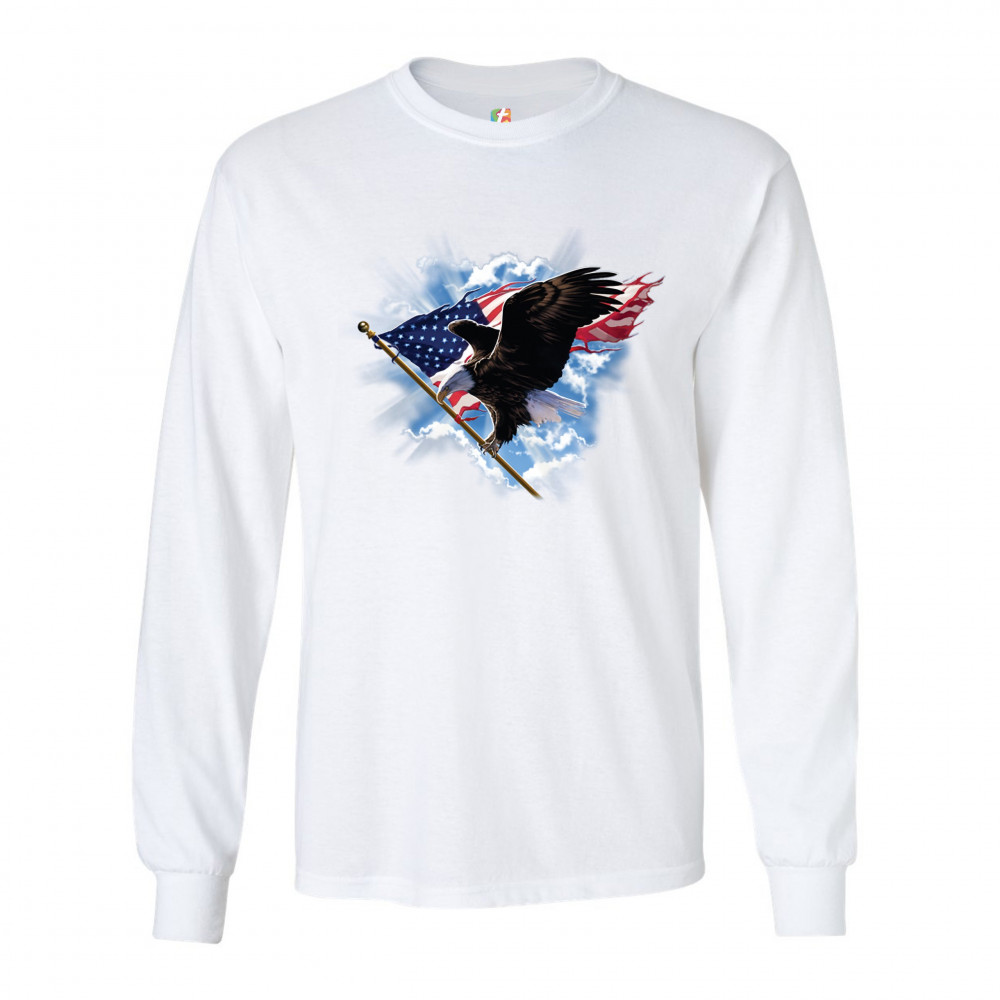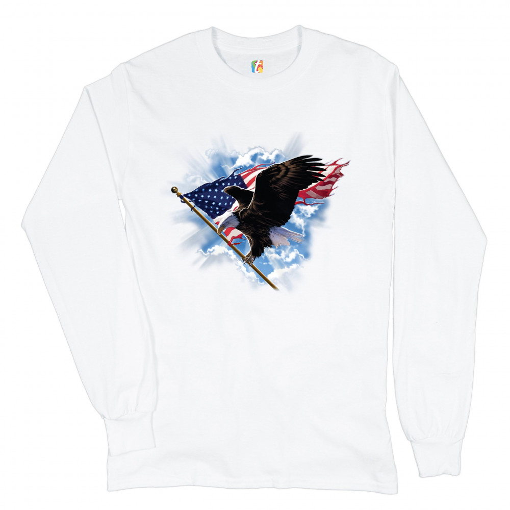 BALD EAGLE CARRYING THE AMERICAN FLAG long sleeve t-shirt 4th of july patriotic white