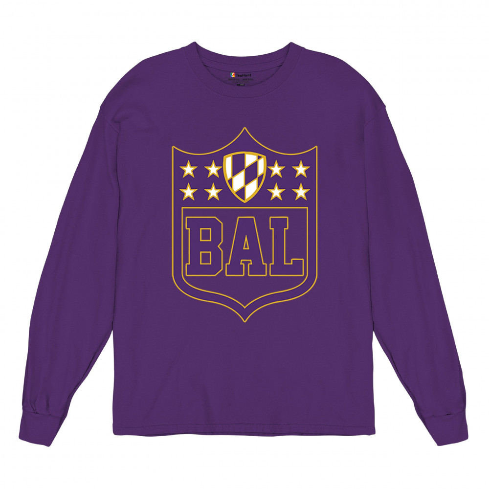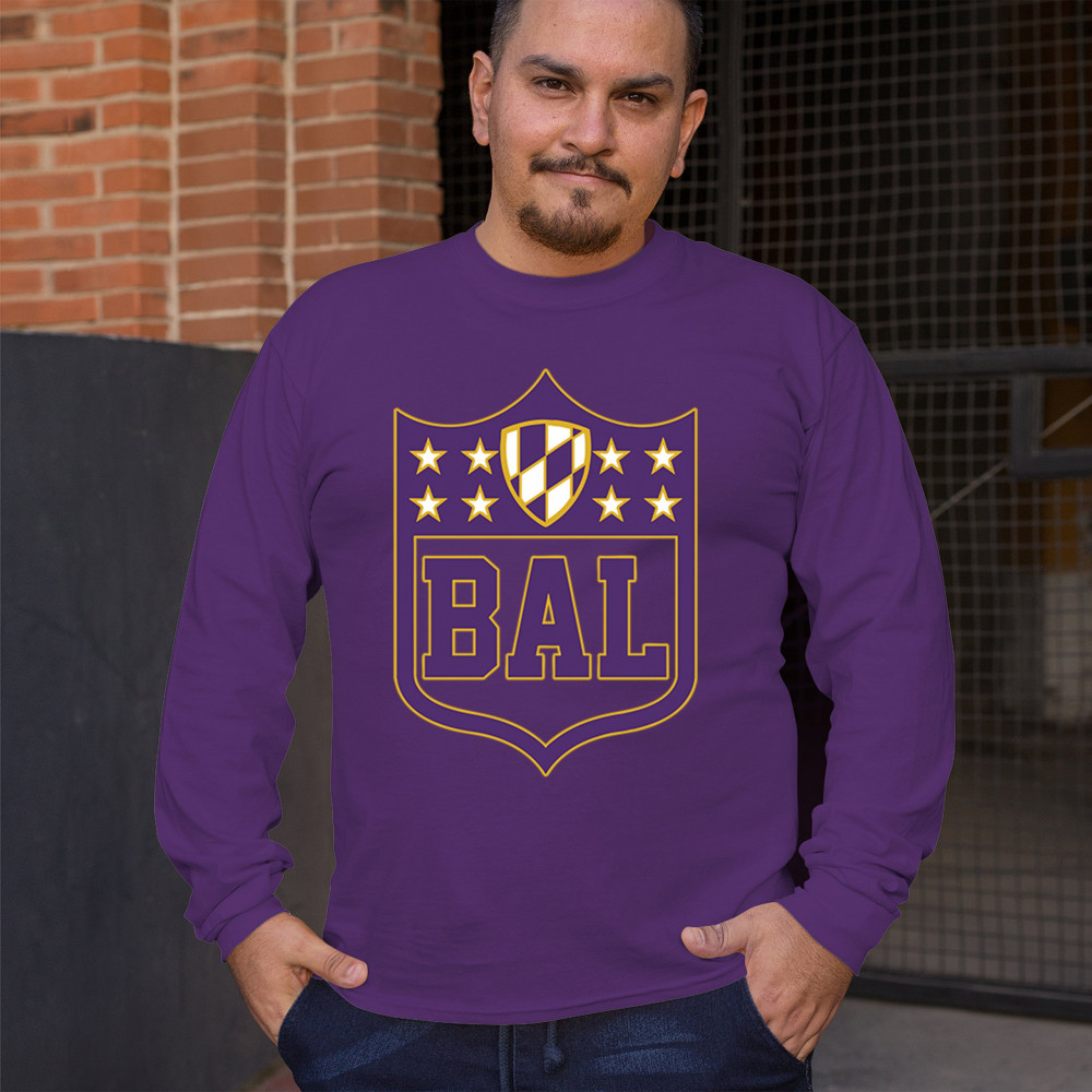 Celebrate your Baltimore pride with this bold BAL shield design. Perfect for football season, this Baltimore athletic shirt blends retro Baltimore football shirt style with collegiate energy. From tailgate party Baltimore tees to vintage BAL sports shirts, it’s built for fans who thrive on touchdown vibes, football culture, and Baltimore city pride. A shield logo Baltimore shirt every fan will love.