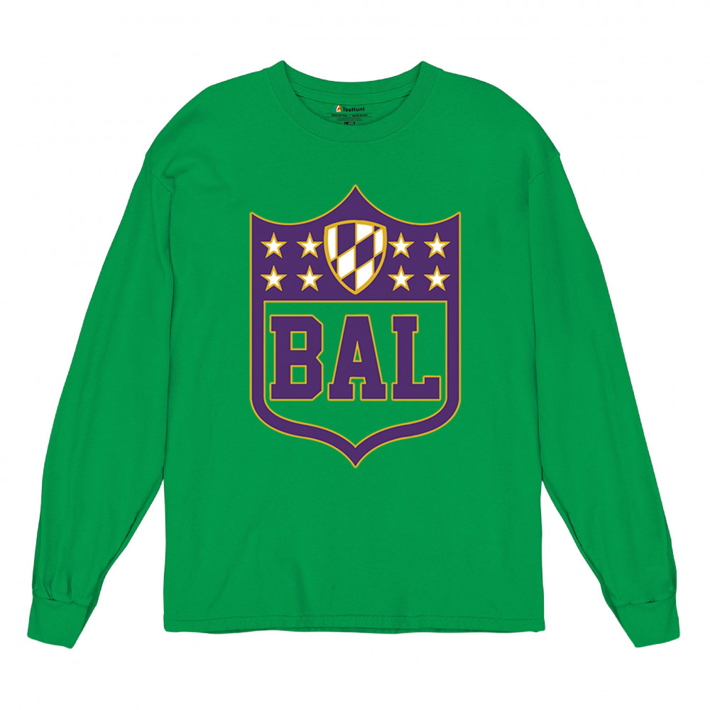 Bold BAL shield design for Baltimore football fans. Vintage sports shirt, collegiate style, and perfect Game Day Baltimore tee.