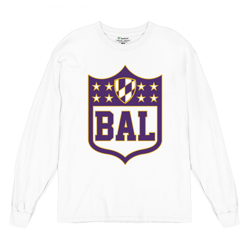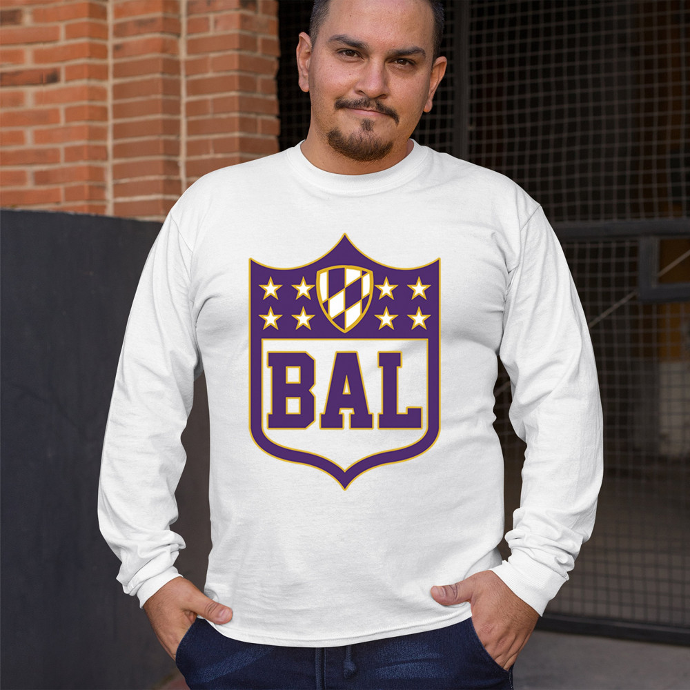 Bold BAL shield design for Baltimore football fans. Vintage sports shirt, collegiate style, and perfect Game Day Baltimore tee.