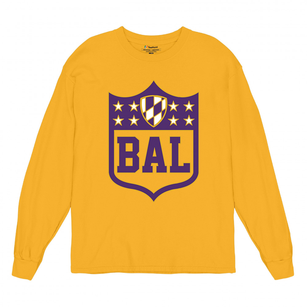 Bold BAL shield design for Baltimore football fans. Vintage sports shirt, collegiate style, and perfect Game Day Baltimore tee.