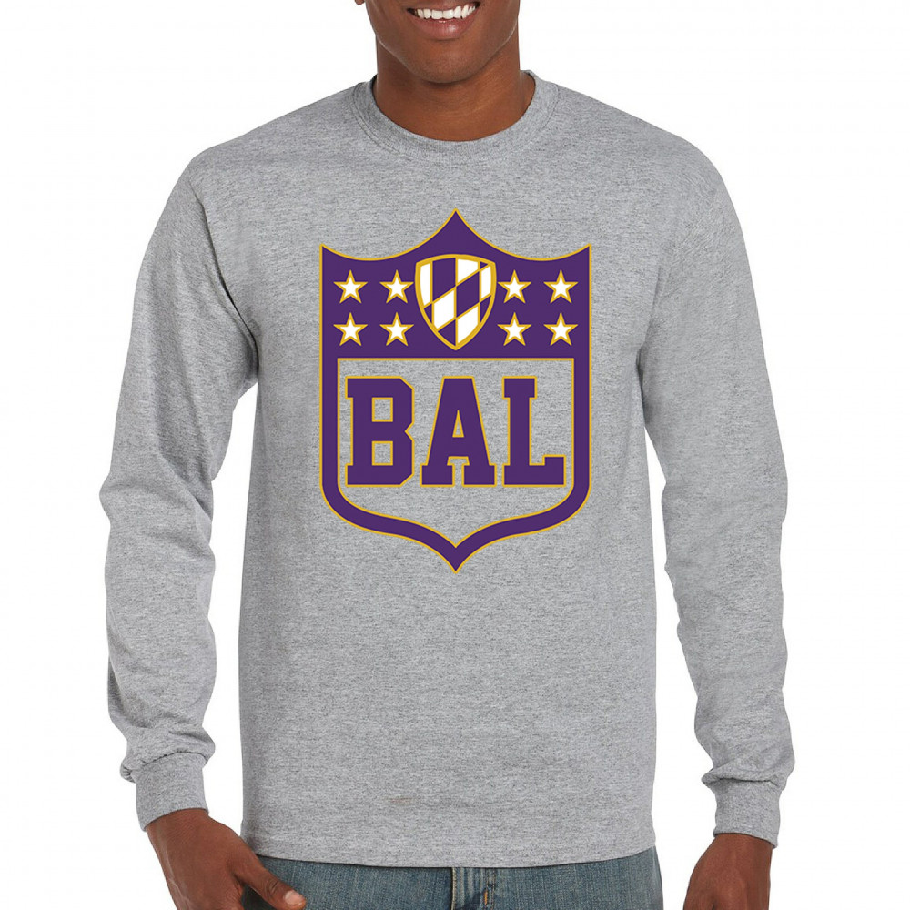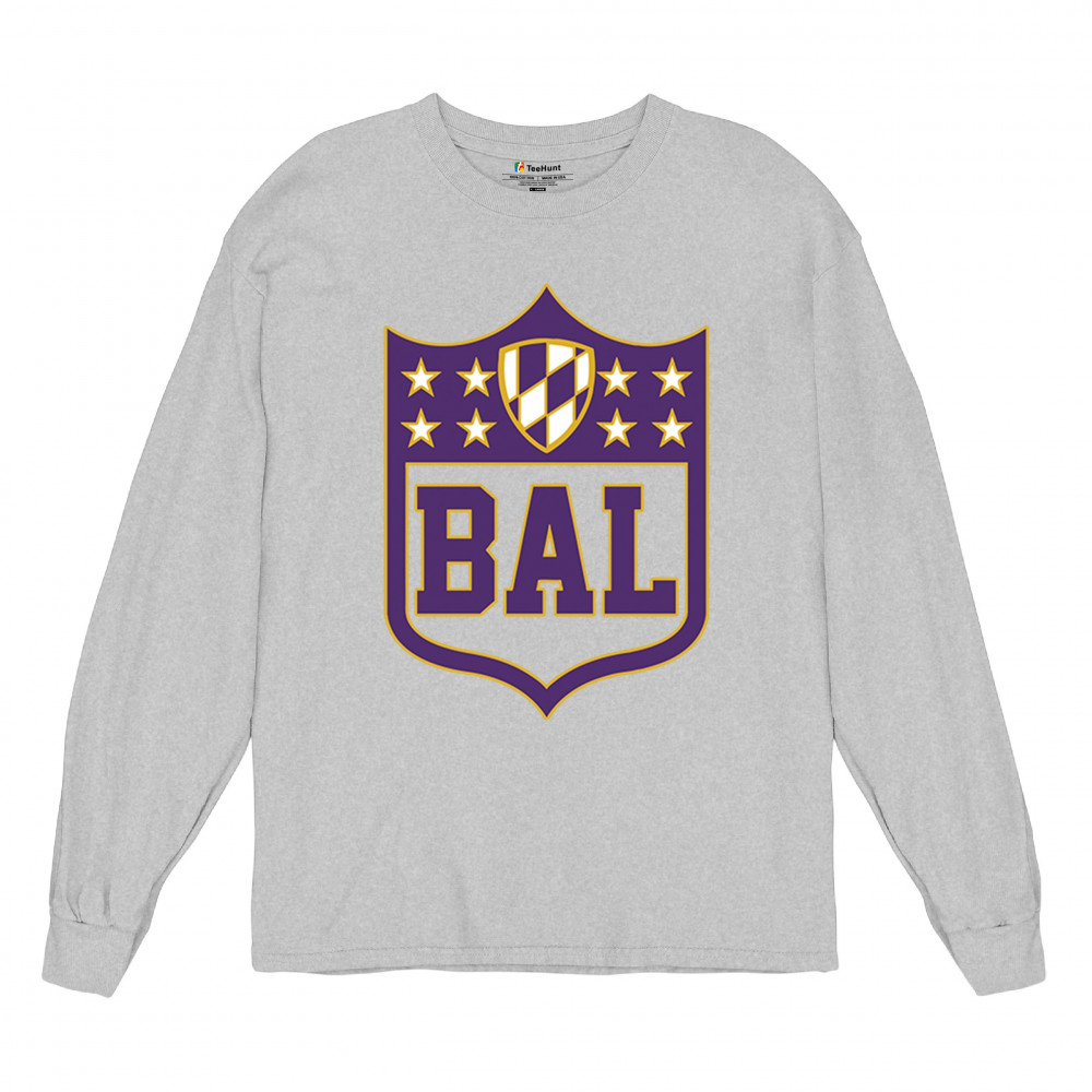 Bold BAL shield design for Baltimore football fans. Vintage sports shirt, collegiate style, and perfect Game Day Baltimore tee.