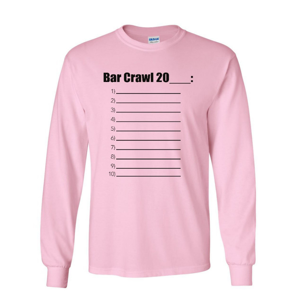 BAR CRAWL 20__ CHECK LIST long sleeve t-shirt drinking college beer booze tee light pink