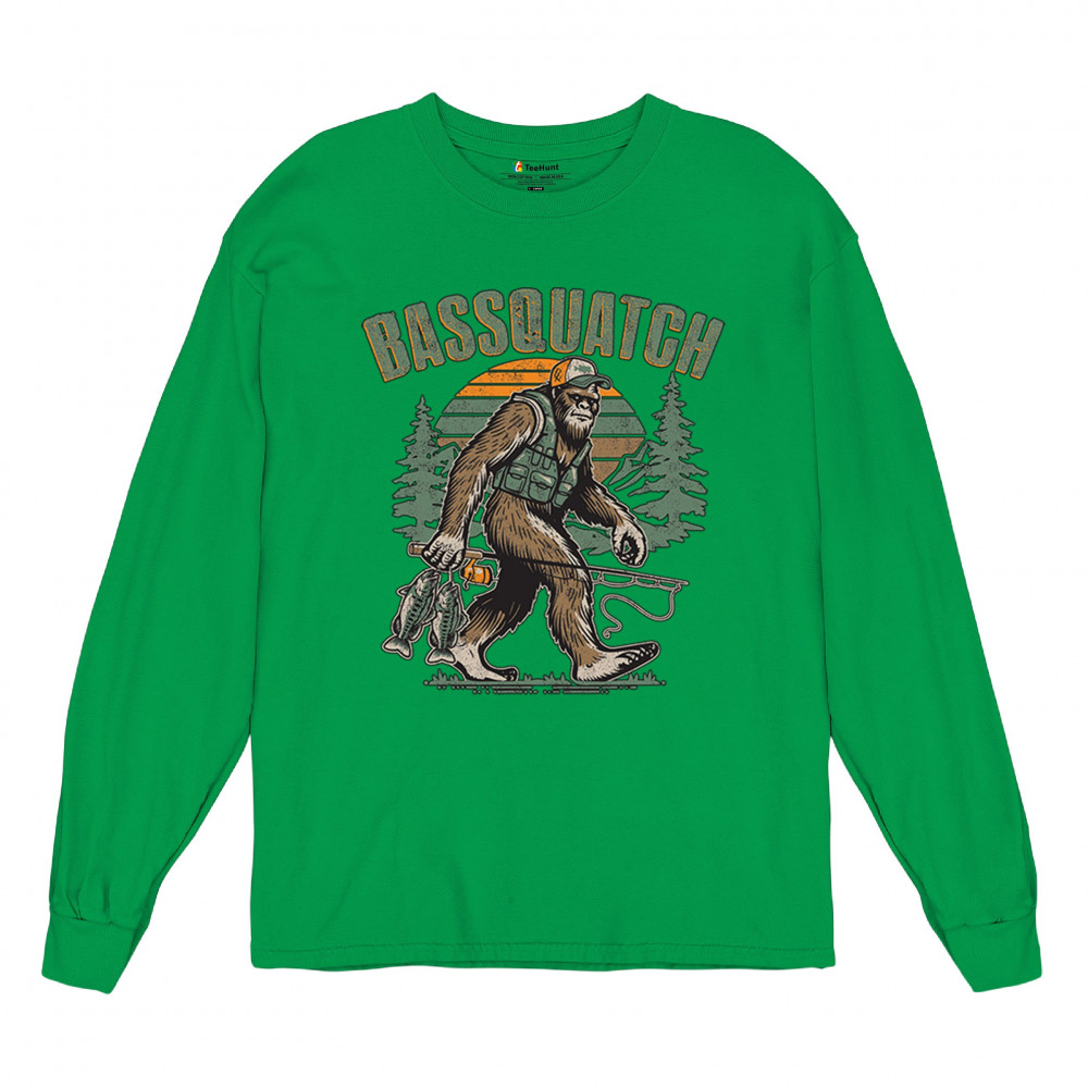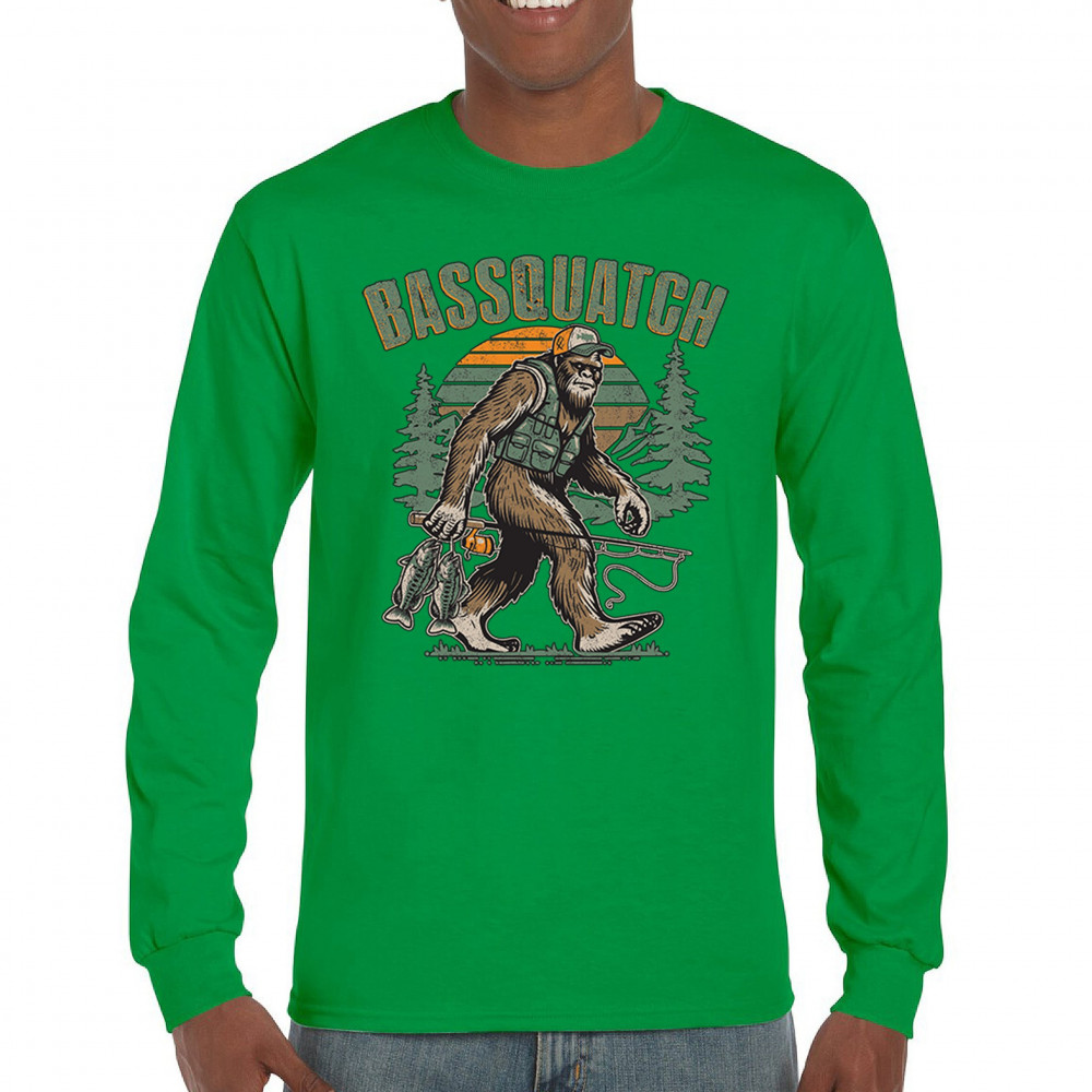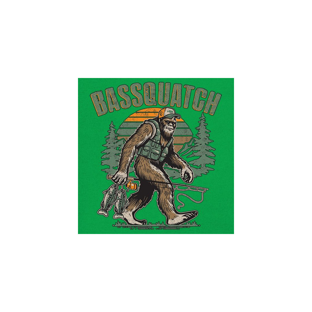 Funny Bassquatch design blends Bigfoot, fishing humor, and retro forest style. Great for anglers, cryptid lovers, and outdoorsy pun fans.