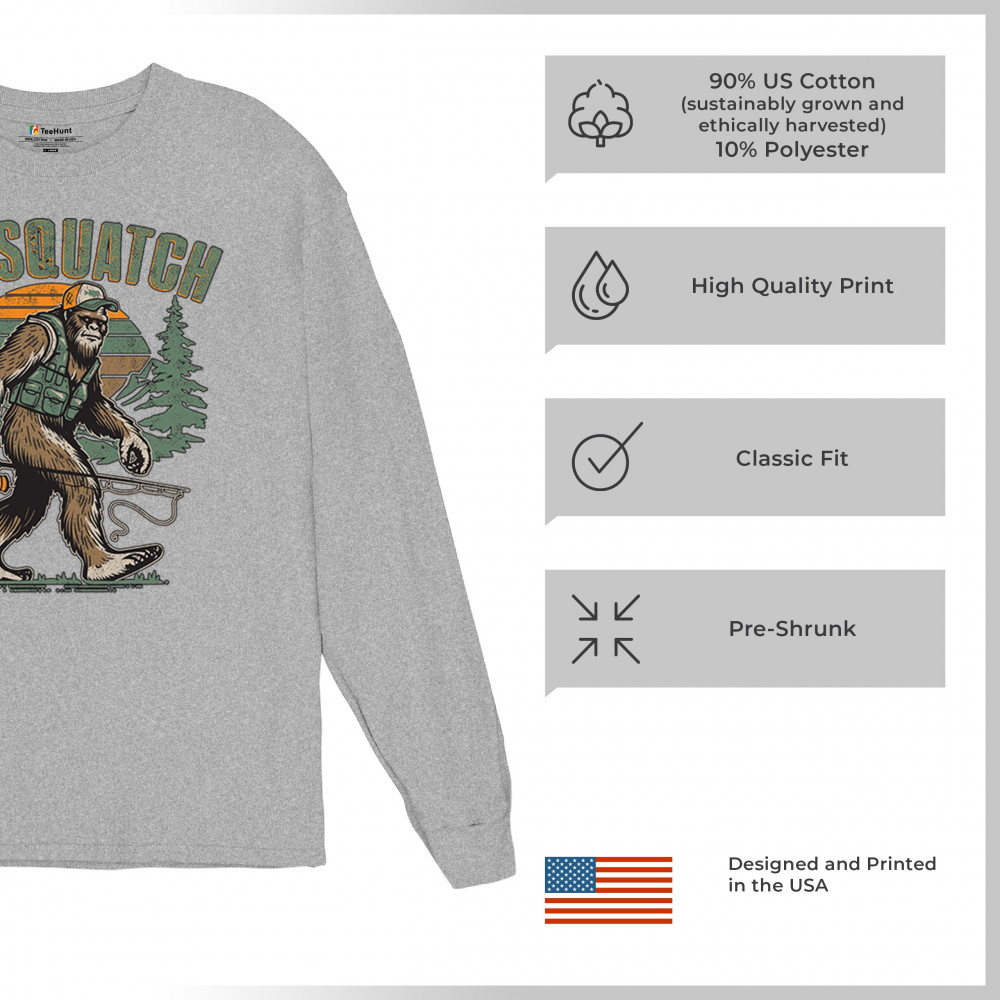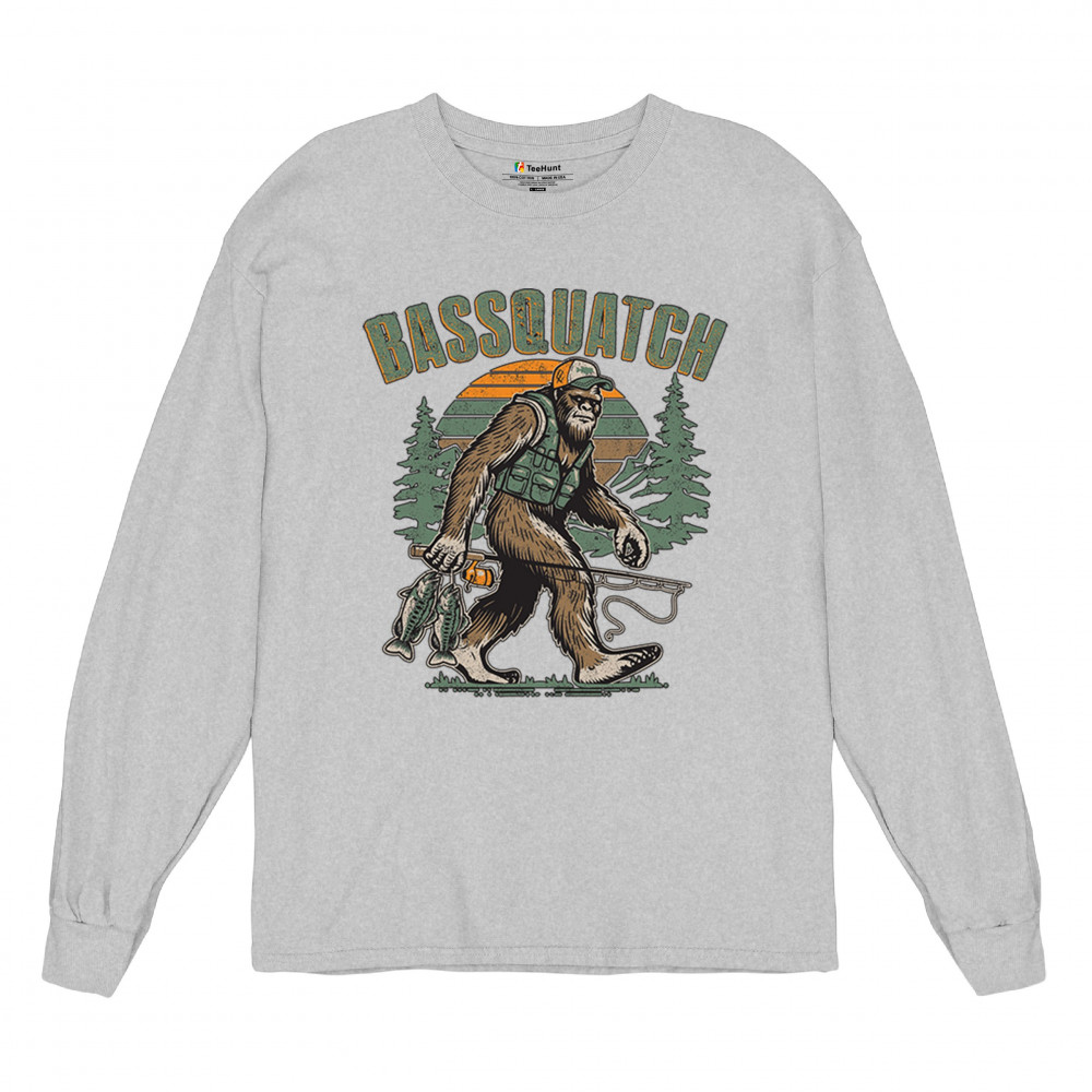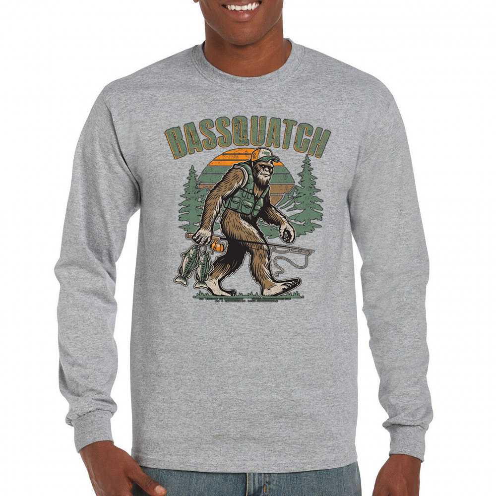 Funny Bassquatch design blends Bigfoot, fishing humor, and retro forest style. Great for anglers, cryptid lovers, and outdoorsy pun fans.