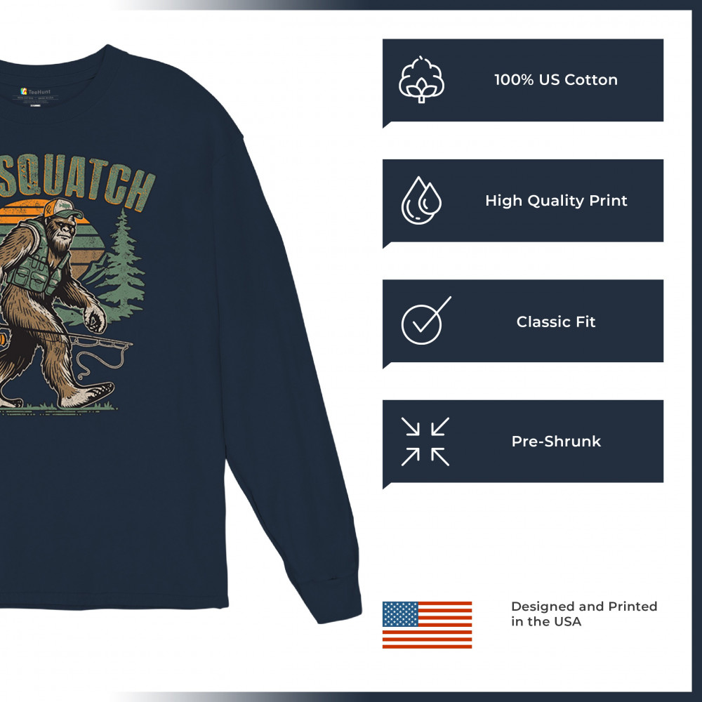 Funny Bassquatch design blends Bigfoot, fishing humor, and retro forest style. Great for anglers, cryptid lovers, and outdoorsy pun fans.