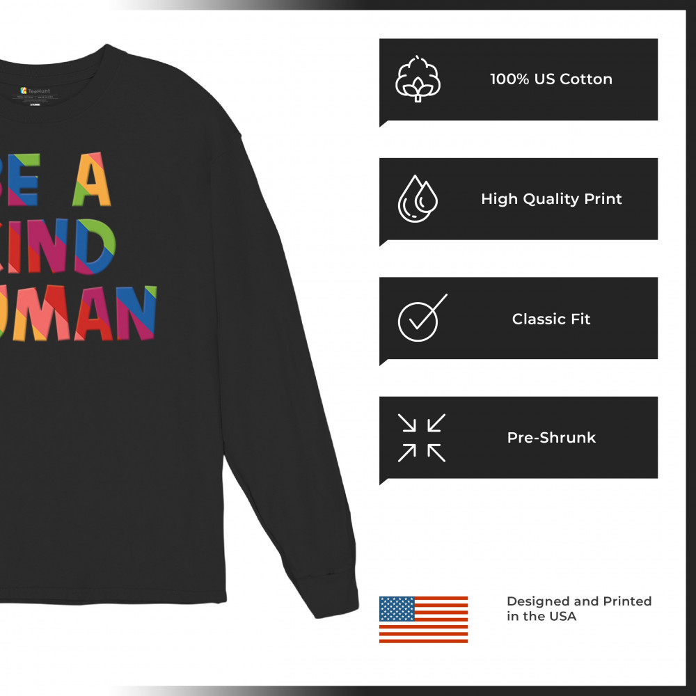 BE A KIND HUMAN PUFF PRINT long sleeve t-shirt positive message diversity peace black