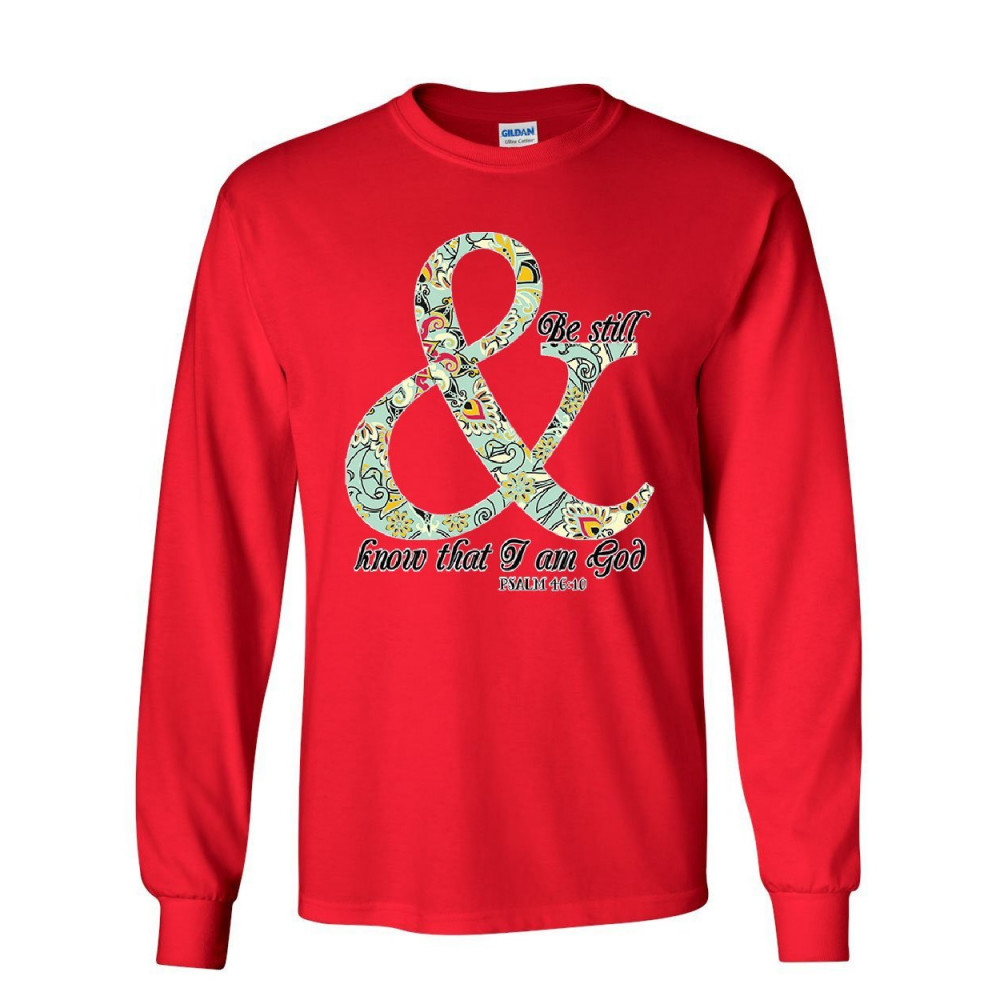 BE STILL & KNOW THAT I AM GOD long sleeve t-shirt religion bible psalm 46:10 tee red