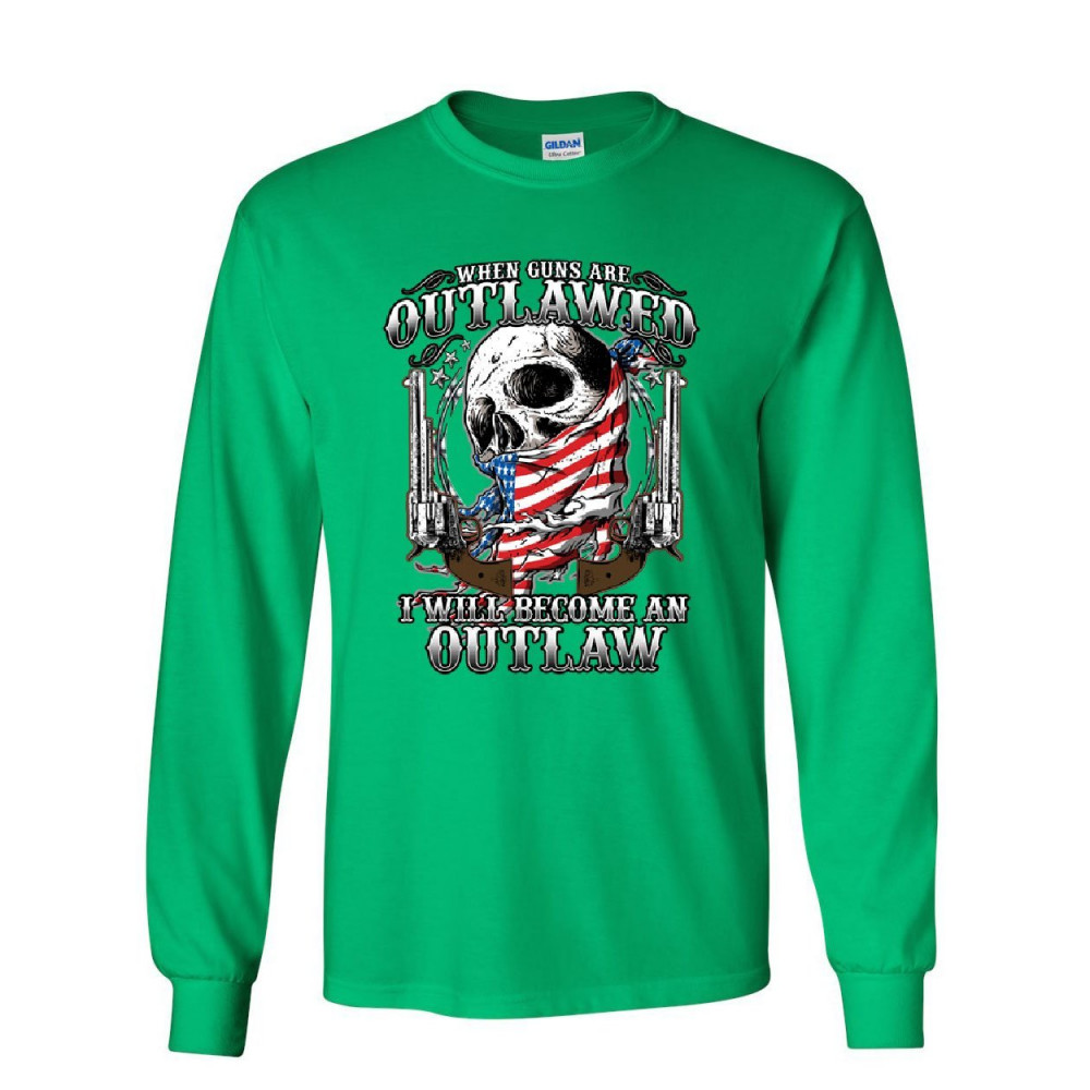BECOME AN OUTLAW long sleeve t-shirt 2nd amendment right to bear arms skull tee green