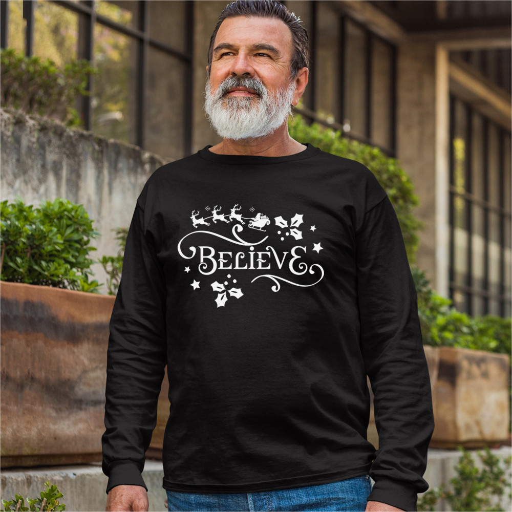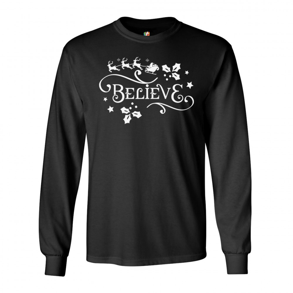 BELIEVE long sleeve t-shirt merry christmas santa sleigh rudolph mistletoe black