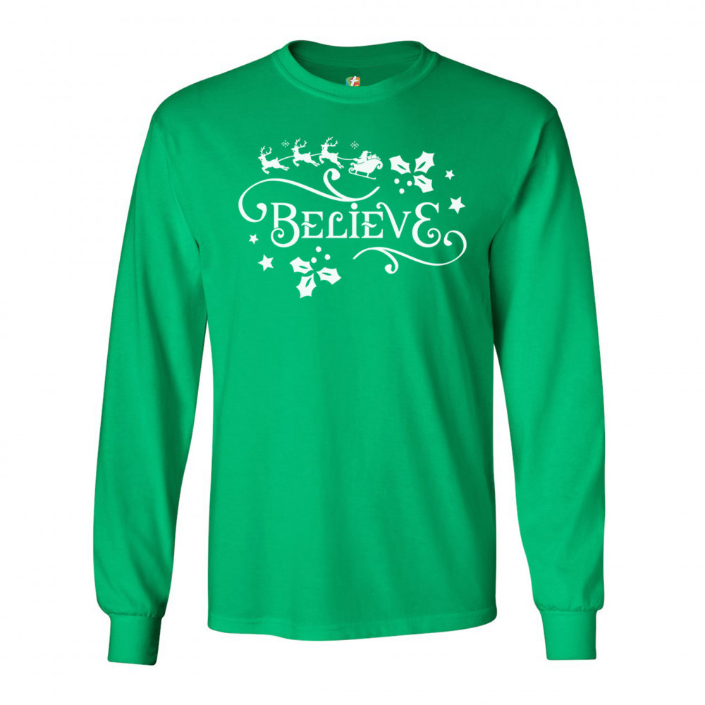 BELIEVE long sleeve t-shirt merry christmas santa sleigh rudolph mistletoe green