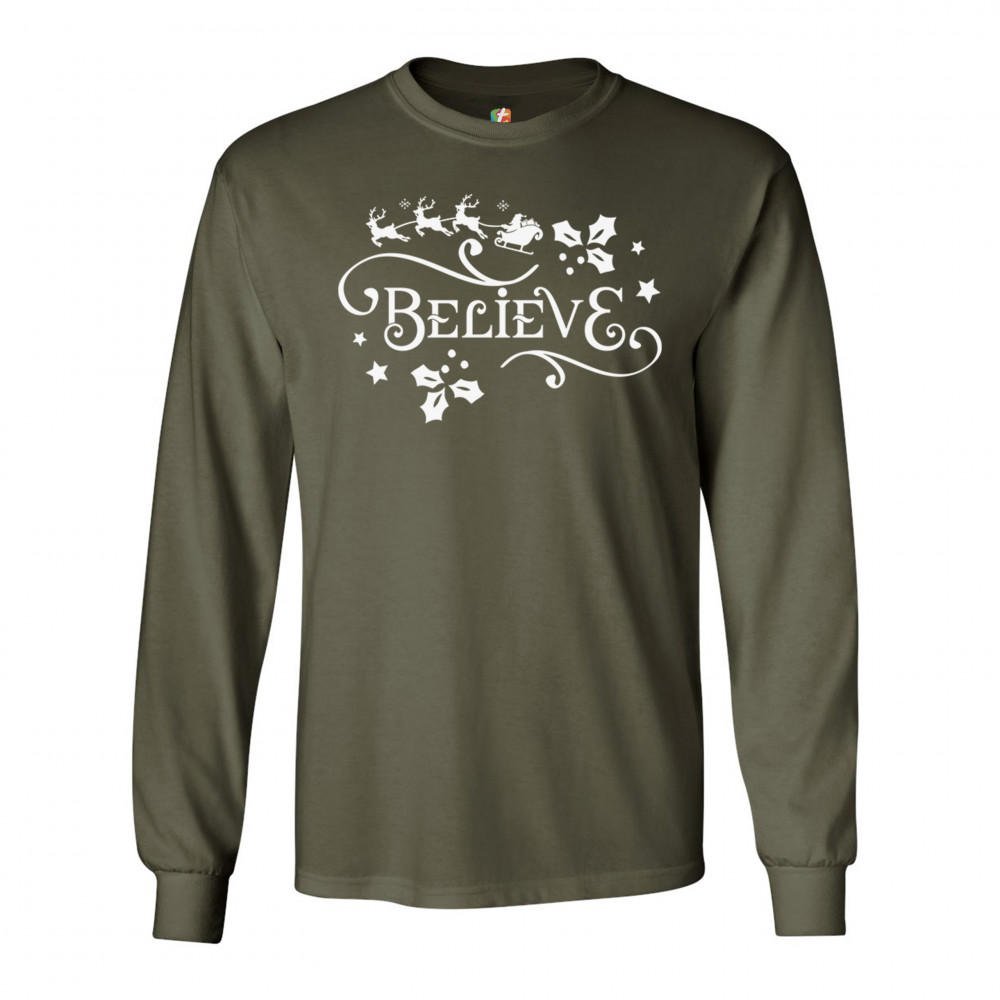 BELIEVE long sleeve t-shirt merry christmas santa sleigh rudolph mistletoe military green