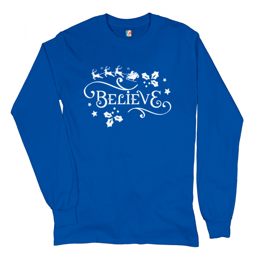 BELIEVE long sleeve t-shirt merry christmas santa sleigh rudolph mistletoe royal blue