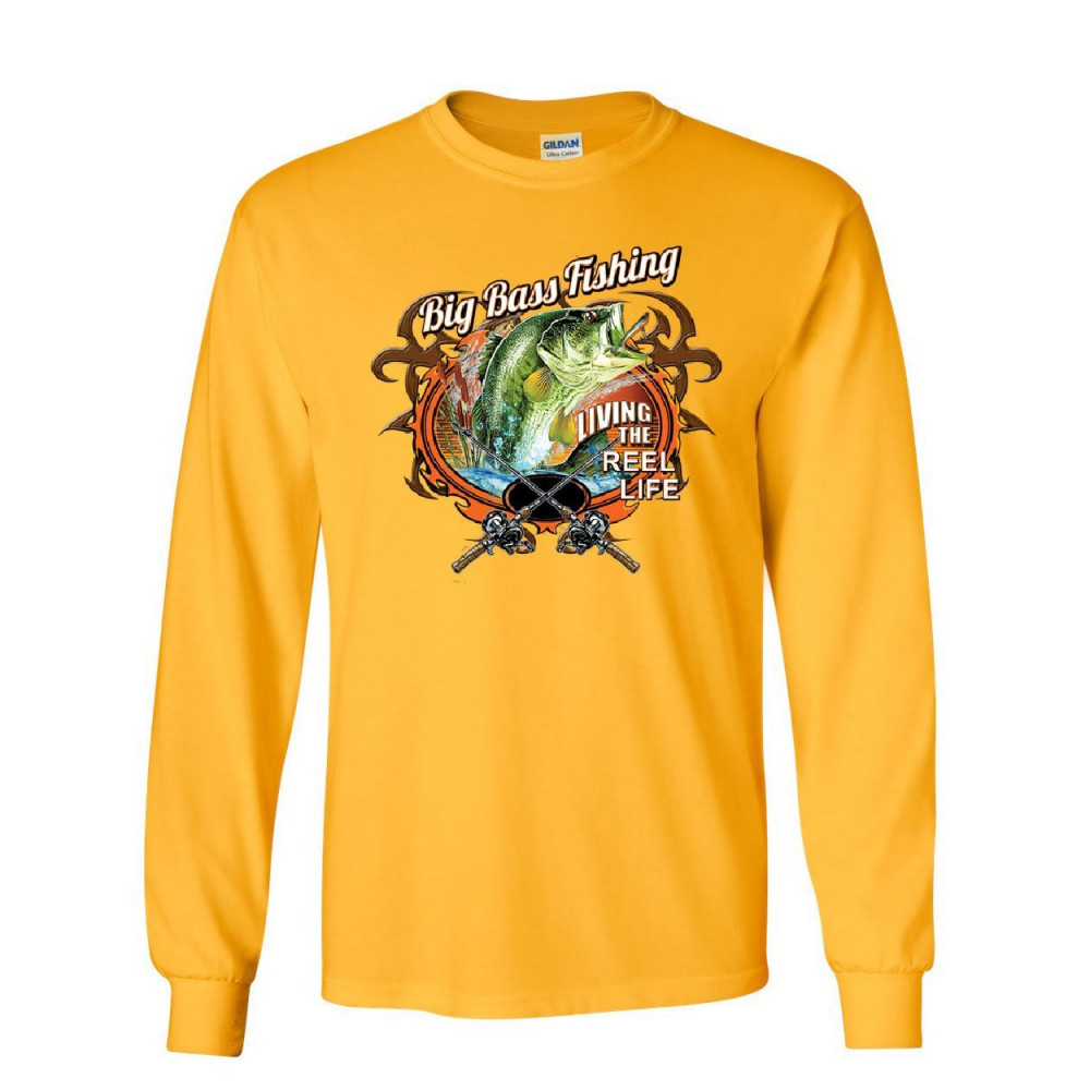 BIG BASS FISHING long sleeve t-shirt living the reel life fisherman spinning tee yellow