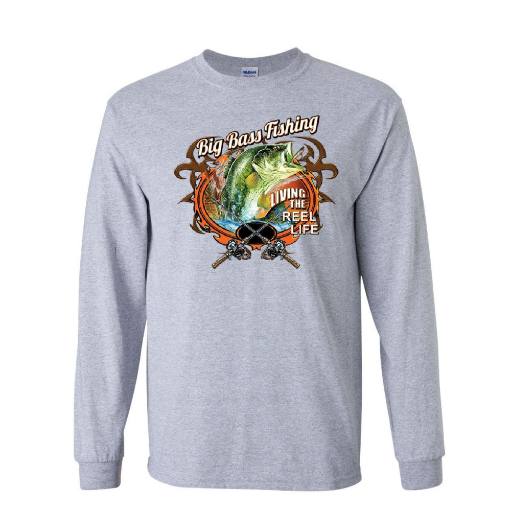 BIG BASS FISHING long sleeve t-shirt living the reel life fisherman spinning tee gray