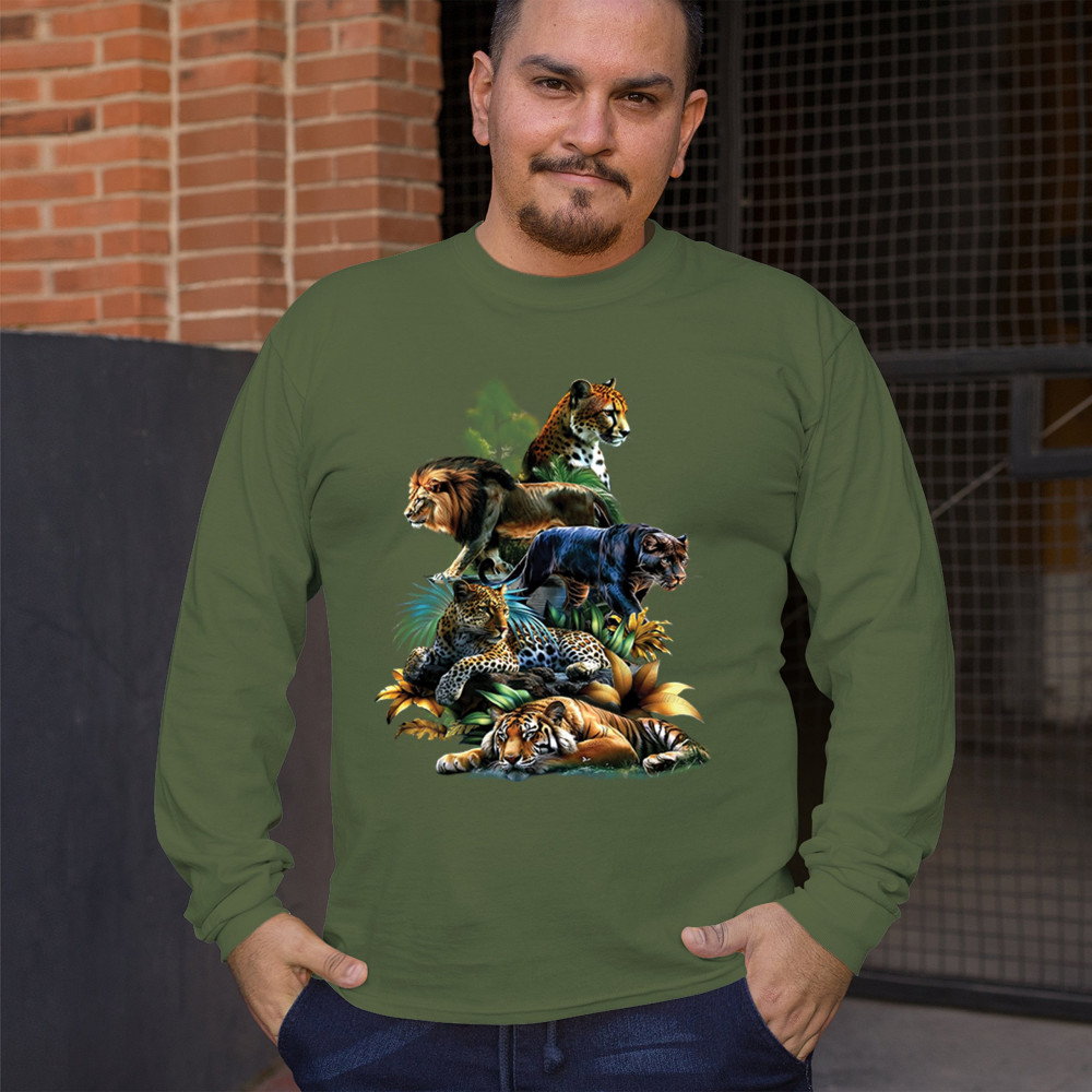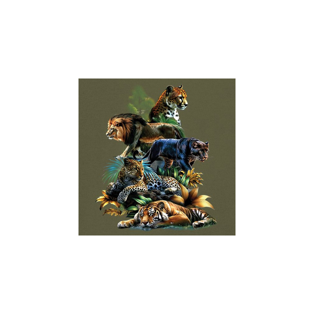 Bold big cat design with lion, tiger, leopard, cheetah, jaguar, and panther. A vivid tribute to wild nature, pride, and animal power.