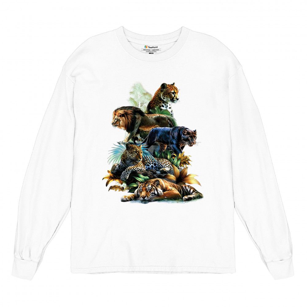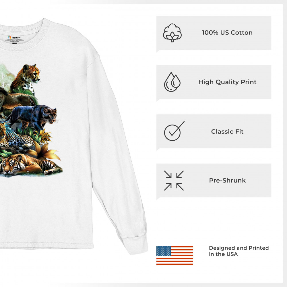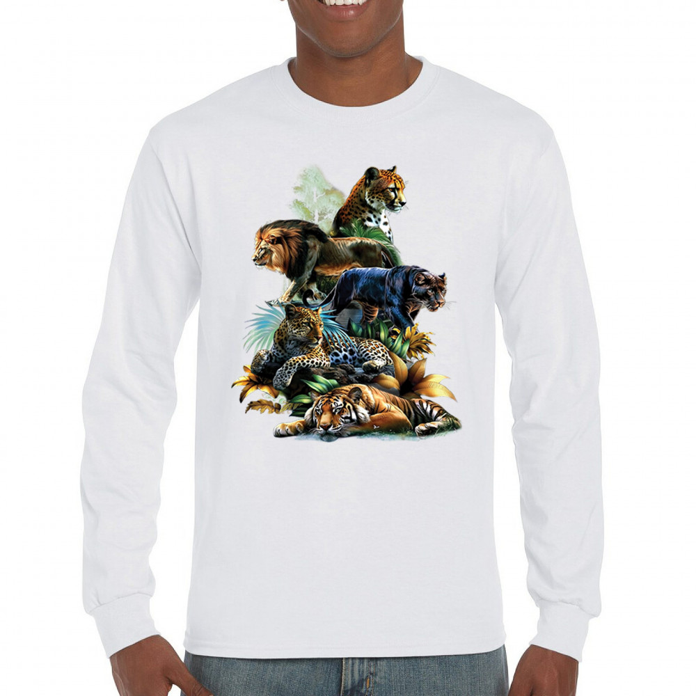 Bold big cat design with lion, tiger, leopard, cheetah, jaguar, and panther. A vivid tribute to wild nature, pride, and animal power.