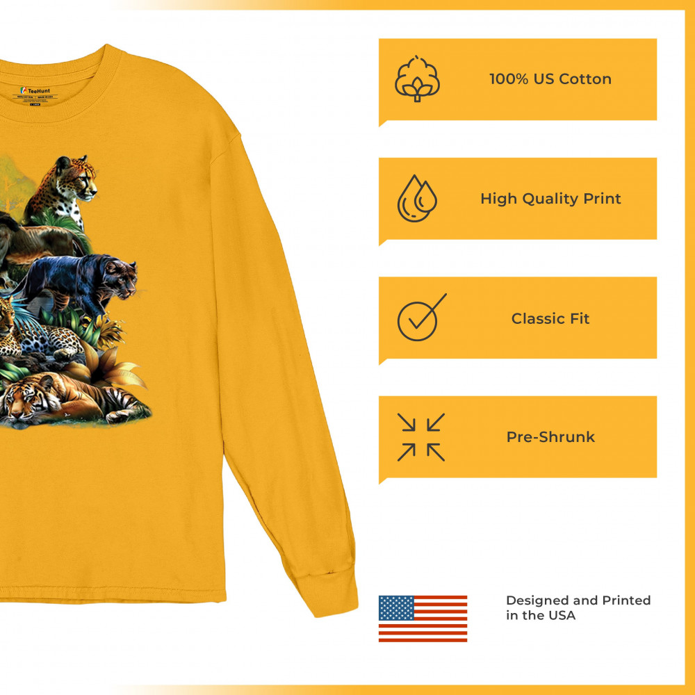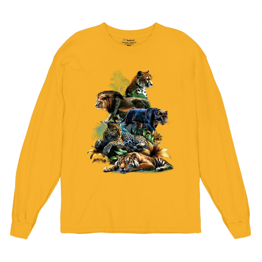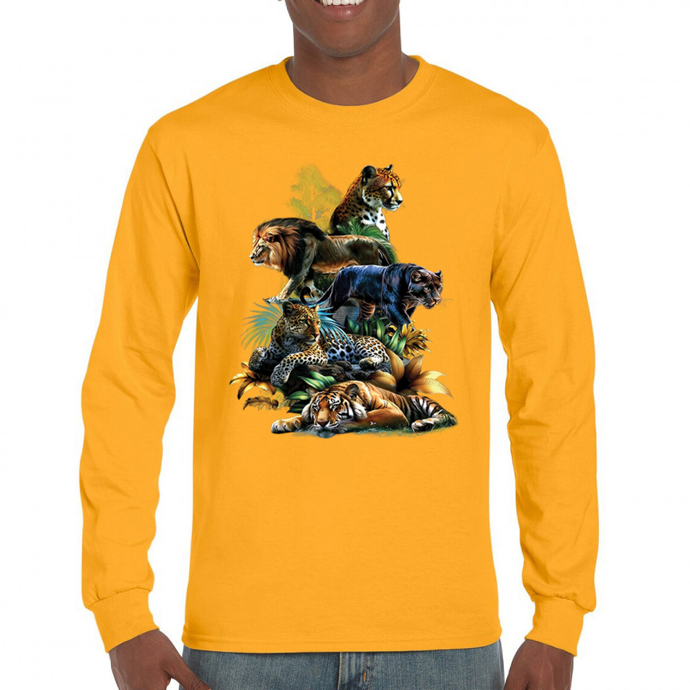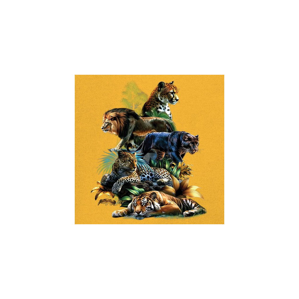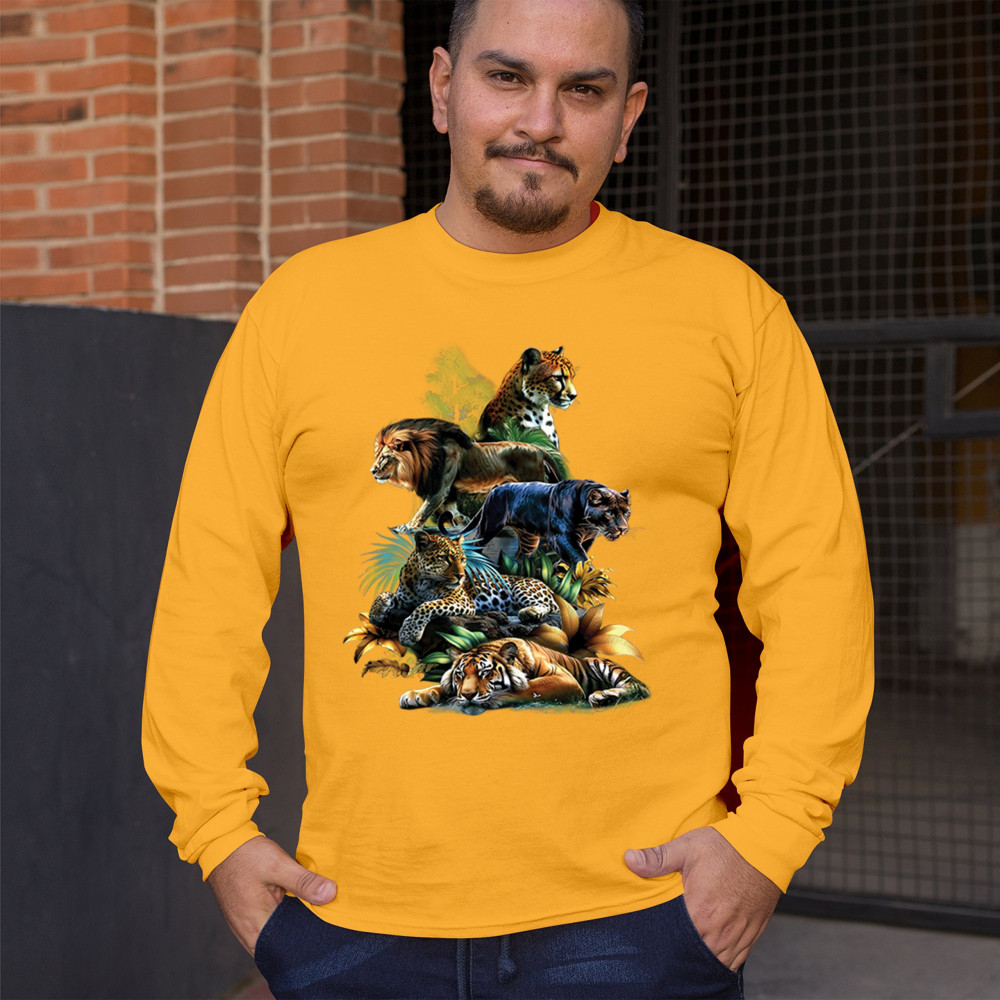 Bold big cat design with lion, tiger, leopard, cheetah, jaguar, and panther. A vivid tribute to wild nature, pride, and animal power.