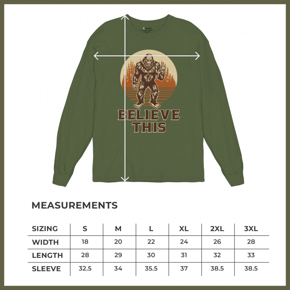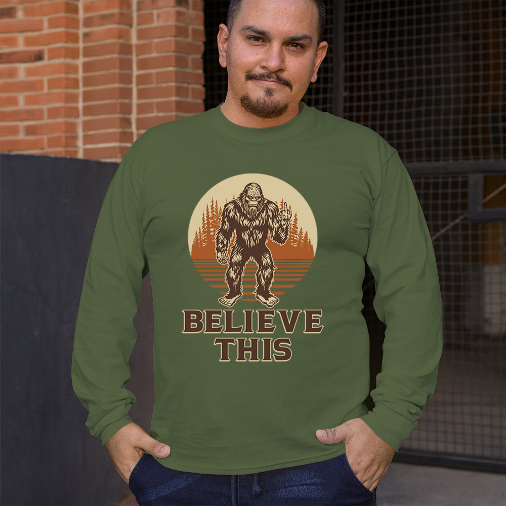 The Believe This Bigfoot design blends cryptid folklore with blunt attitude—because sometimes you just don’t care who believes. Featuring Bigfoot flipping the bird against a rustic tree line, it’s perfect for campers, rebels, and fans of sarcastic forest humor. Ideal for hikes, festivals, and off-grid living.