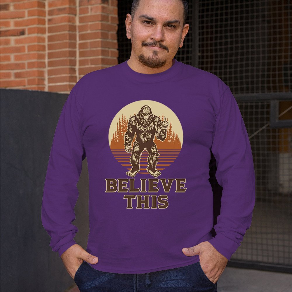 The Believe This Bigfoot design blends cryptid folklore with blunt attitude—because sometimes you just don’t care who believes. Featuring Bigfoot flipping the bird against a rustic tree line, it’s perfect for campers, rebels, and fans of sarcastic forest humor. Ideal for hikes, festivals, and off-grid living.
