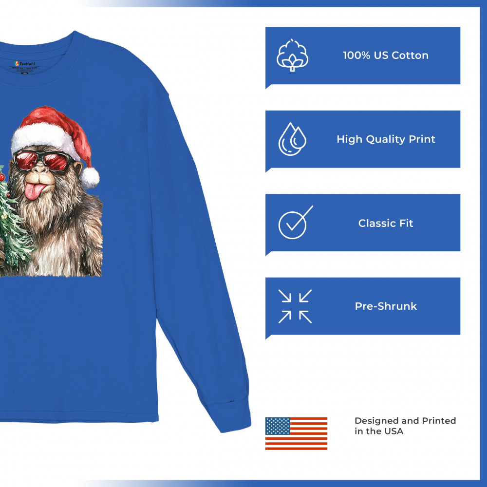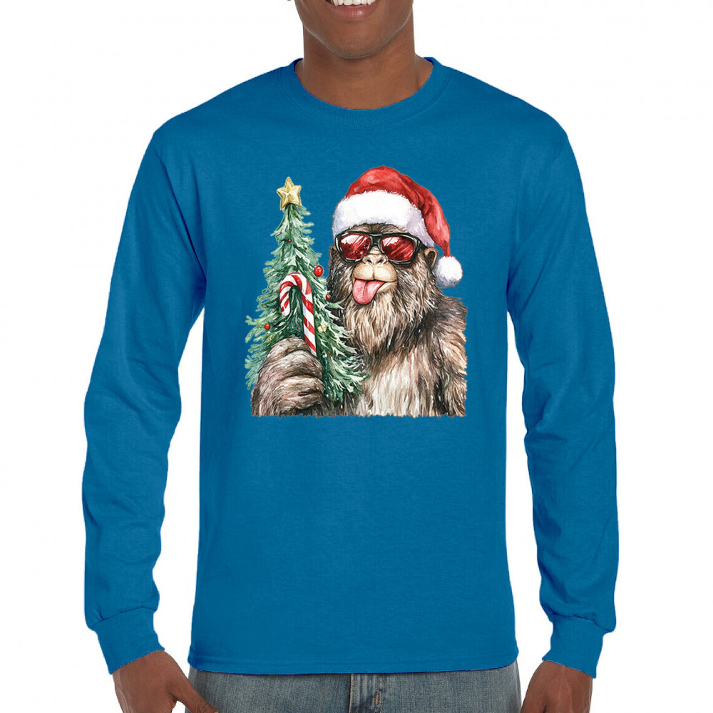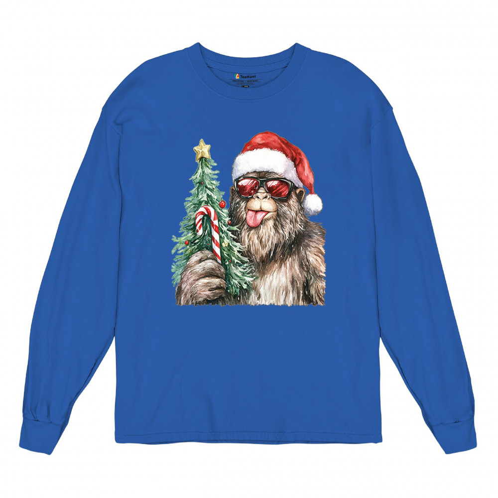 Bigfoot Christmas Santa shirt – festive Sasquatch holiday humor tee with Santa hat design, Xmas tree, candy cane, and funny Christmas style.
