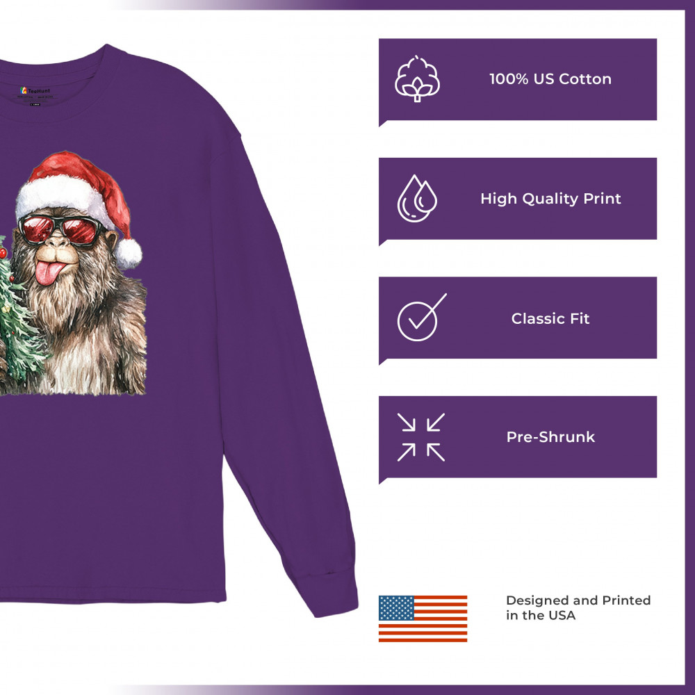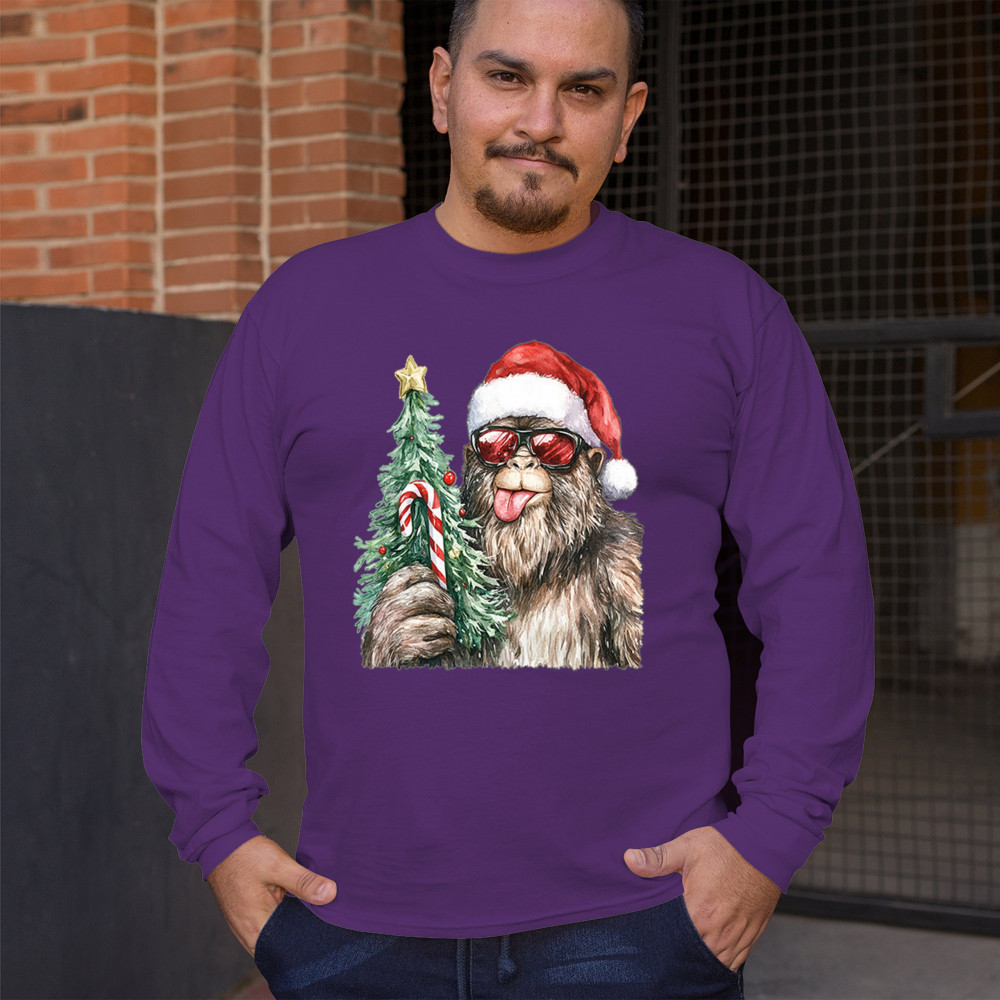 Bigfoot Christmas Santa shirt – festive Sasquatch holiday humor tee with Santa hat design, Xmas tree, candy cane, and funny Christmas style.