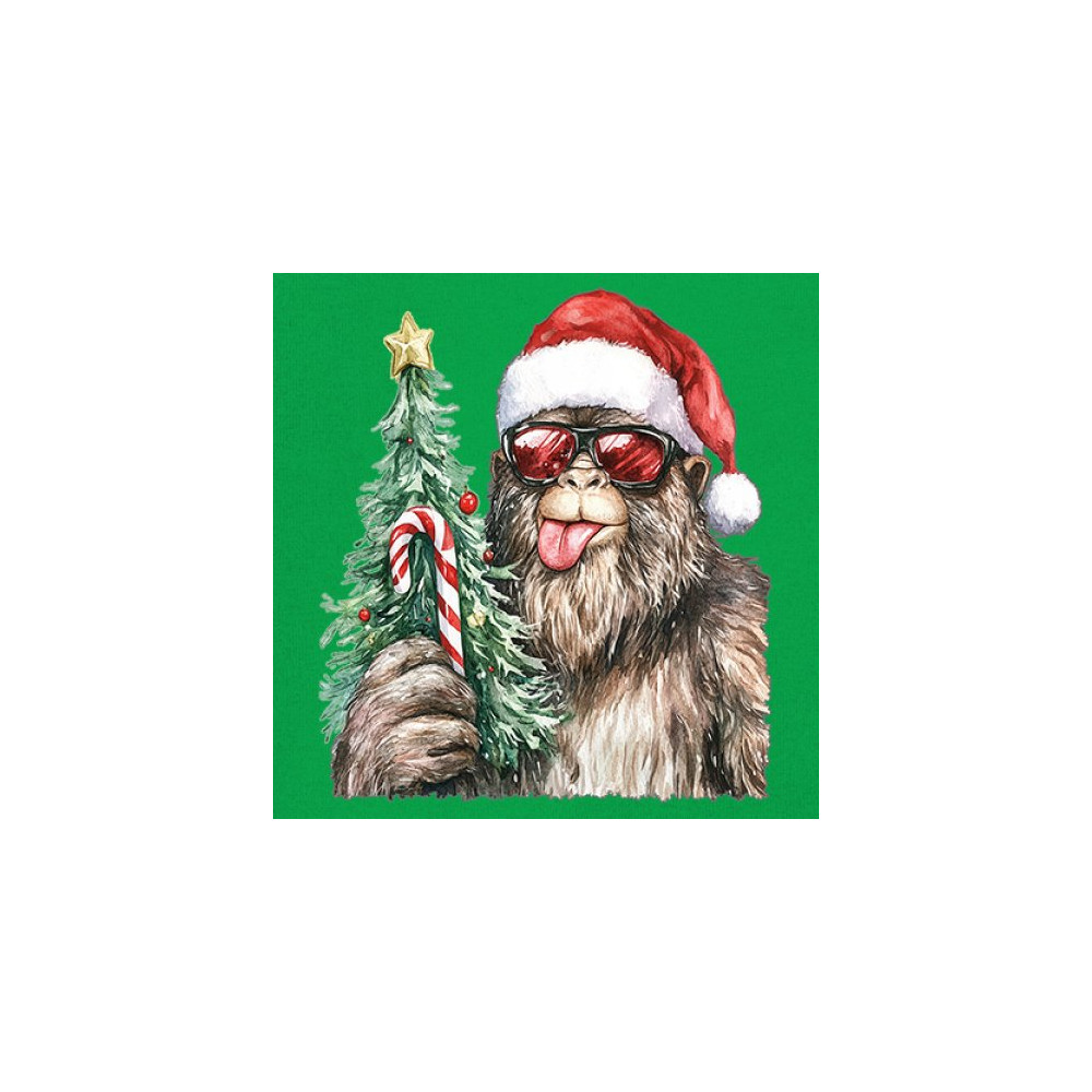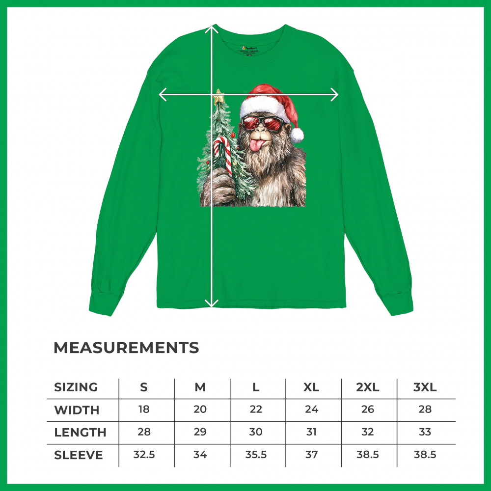 Bigfoot Christmas Santa shirt – festive Sasquatch holiday humor tee with Santa hat design, Xmas tree, candy cane, and funny Christmas style.