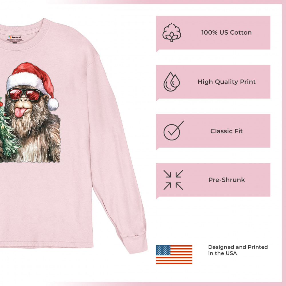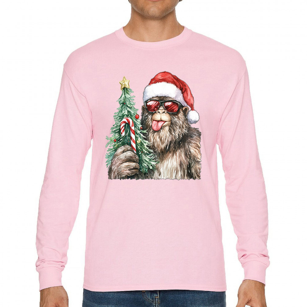 Bigfoot Christmas Santa shirt – festive Sasquatch holiday humor tee with Santa hat design, Xmas tree, candy cane, and funny Christmas style.