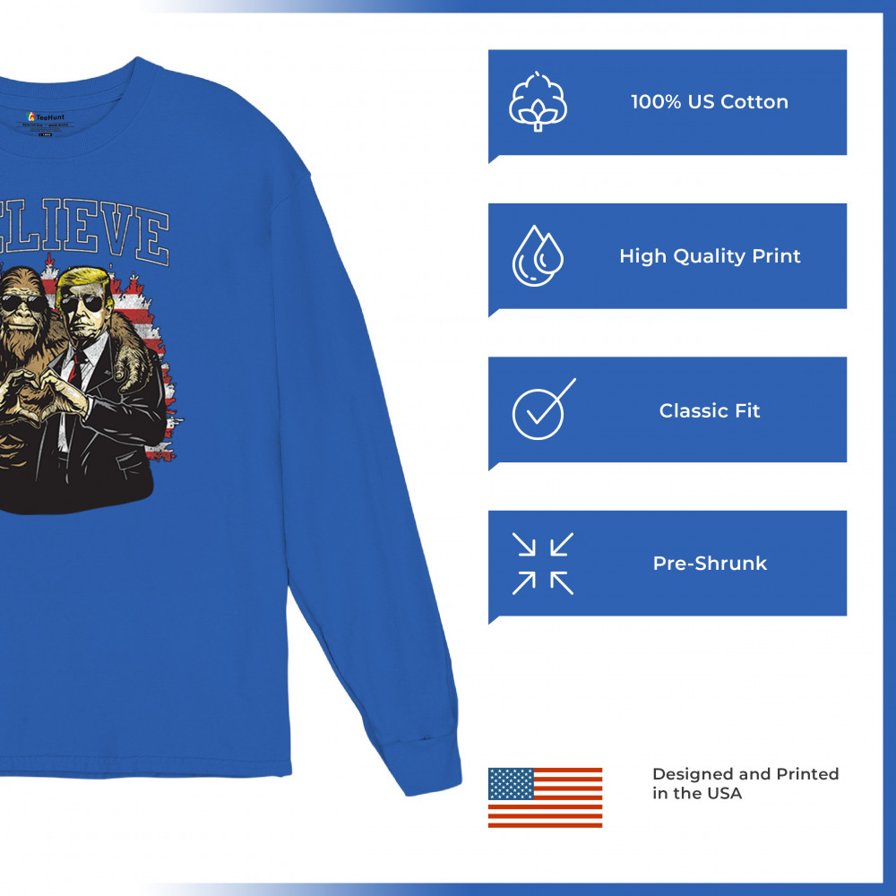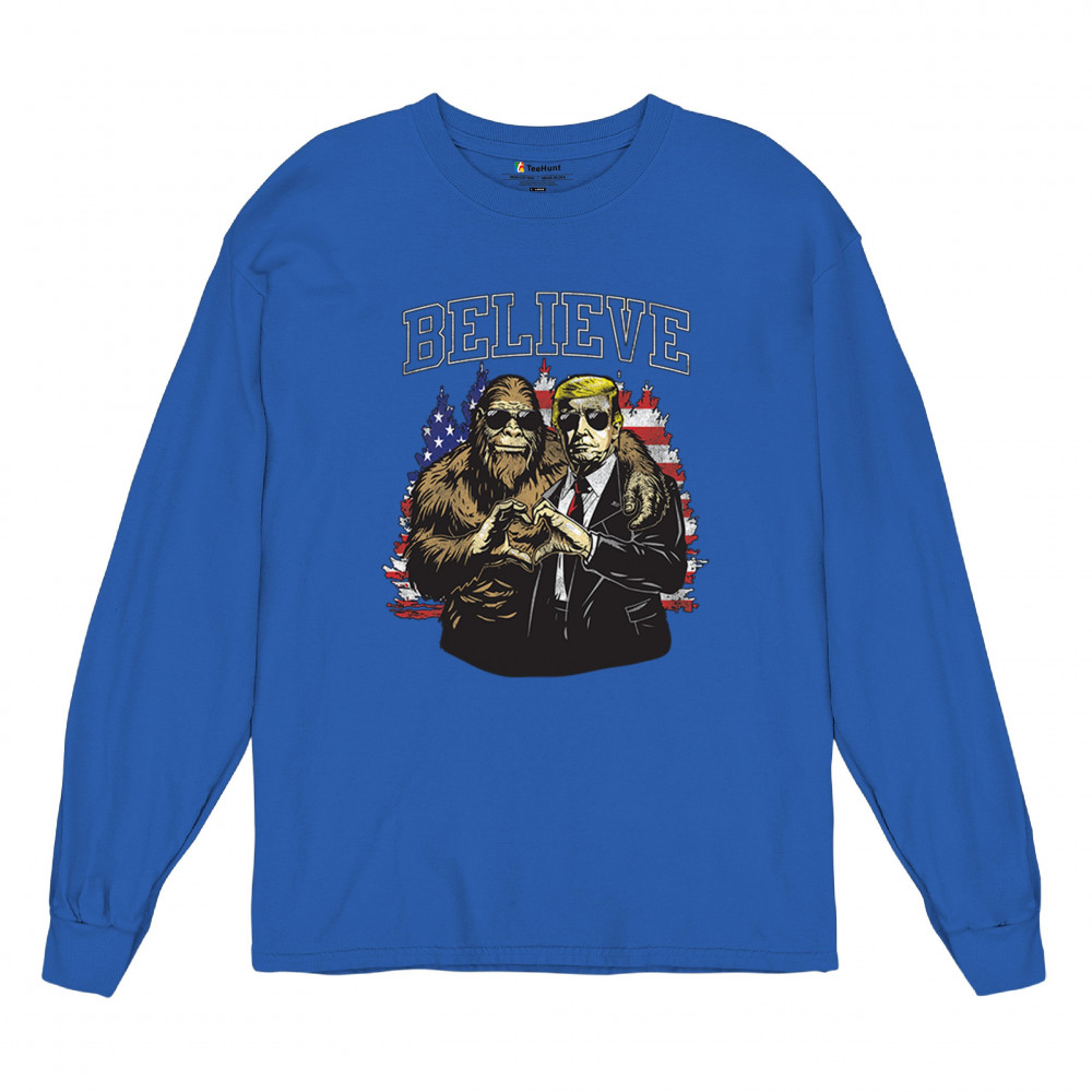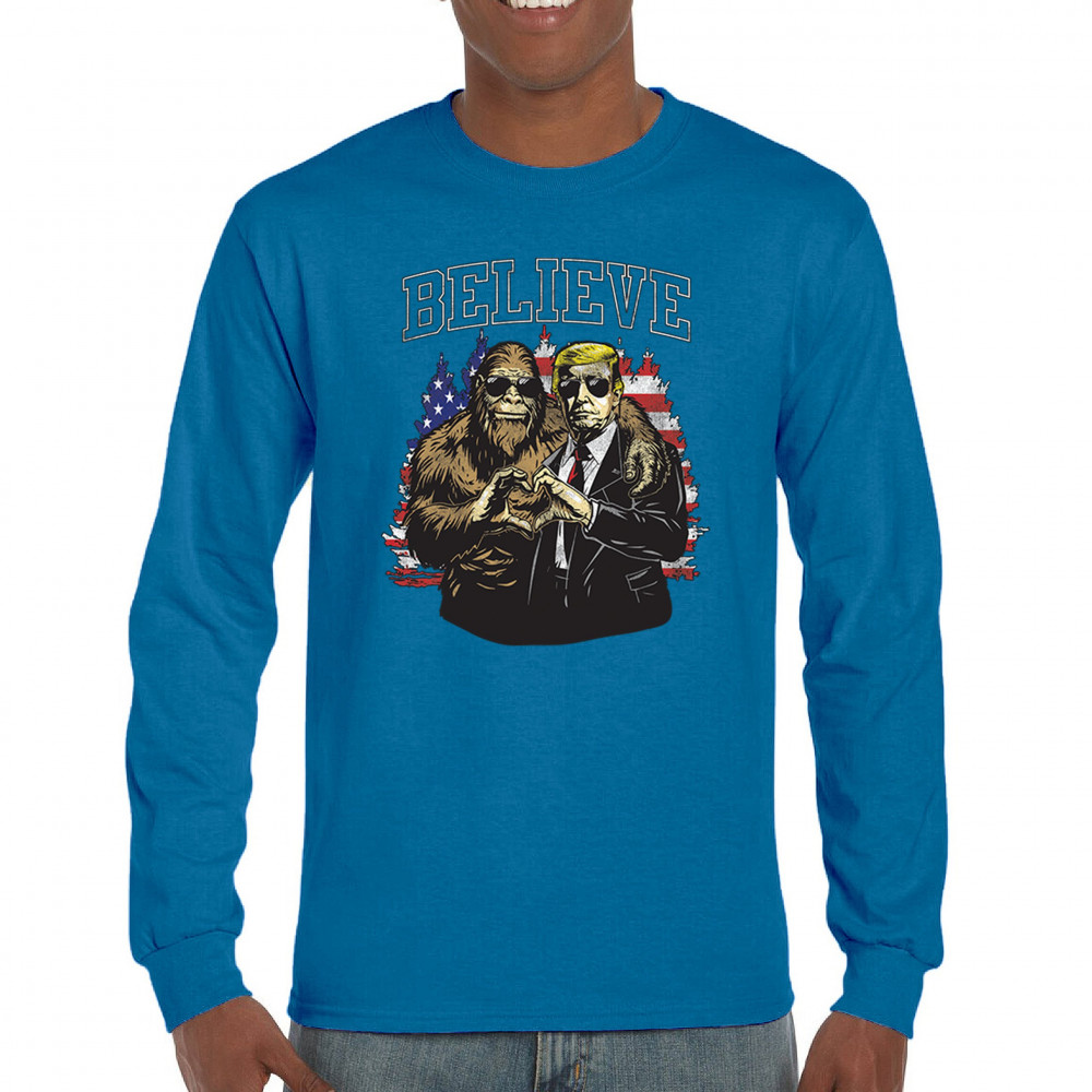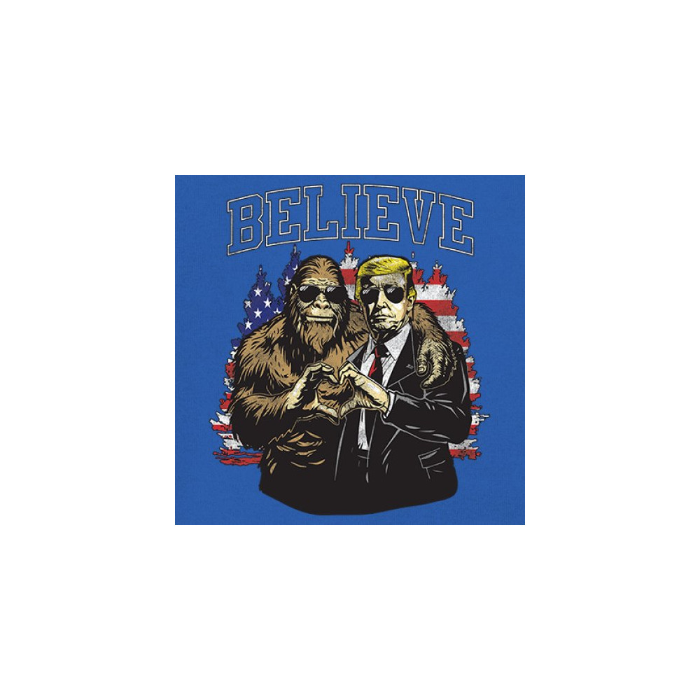 The "Believe" design combines patriotic pride and conservative values with a touch of fun. Featuring Donald J. Trump and a loyal Bigfoot against the American flag, this graphic is perfect for Trump supporters, Republicans, and believers in America First. Celebrate the Red Wave, the 47th President, and the unstoppable fight for victory. Ideal for anyone with unwavering belief in the people's mandate.