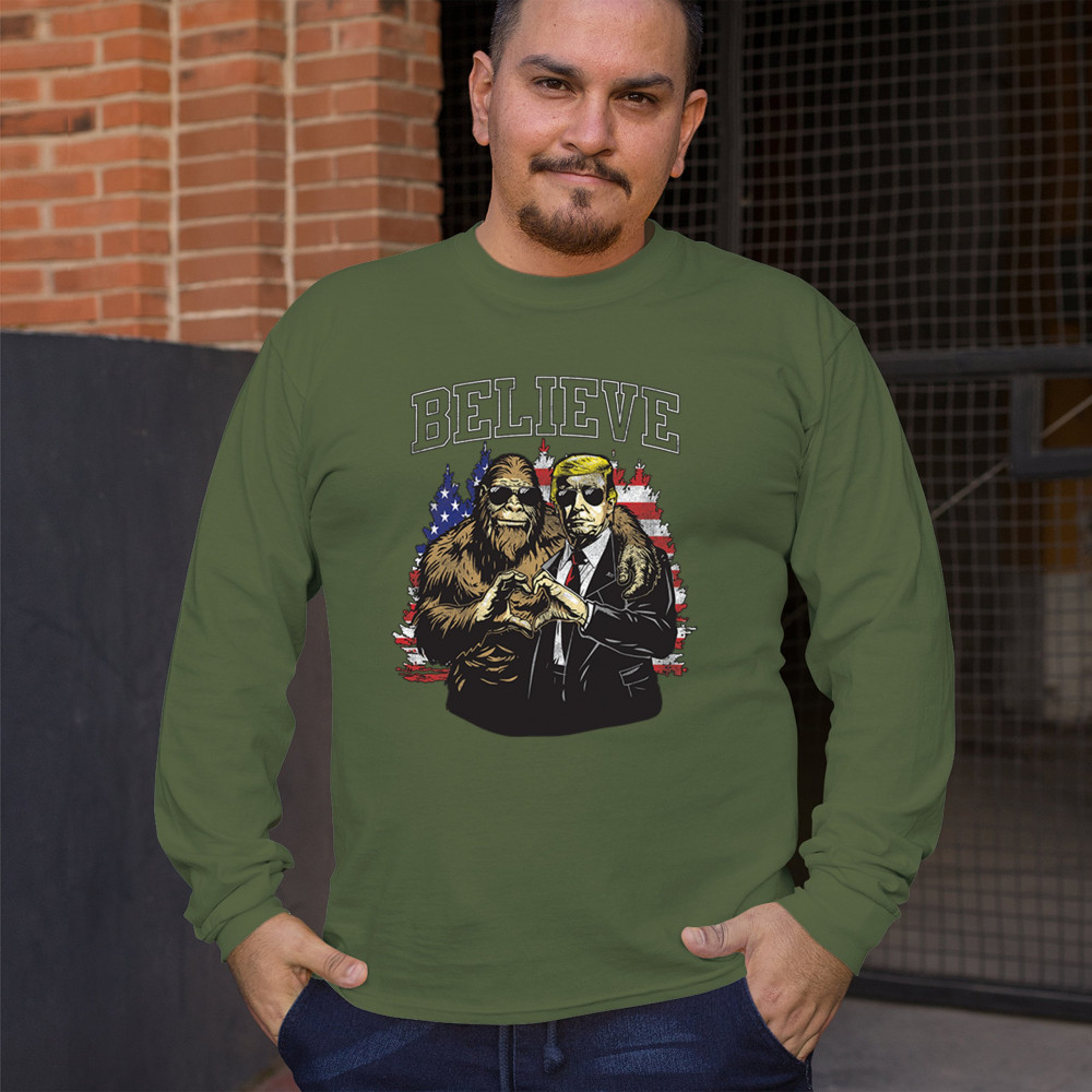 The "Believe" design combines patriotic pride and conservative values with a touch of fun. Featuring Donald J. Trump and a loyal Bigfoot against the American flag, this graphic is perfect for Trump supporters, Republicans, and believers in America First. Celebrate the Red Wave, the 47th President, and the unstoppable fight for victory. Ideal for anyone with unwavering belief in the people's mandate.