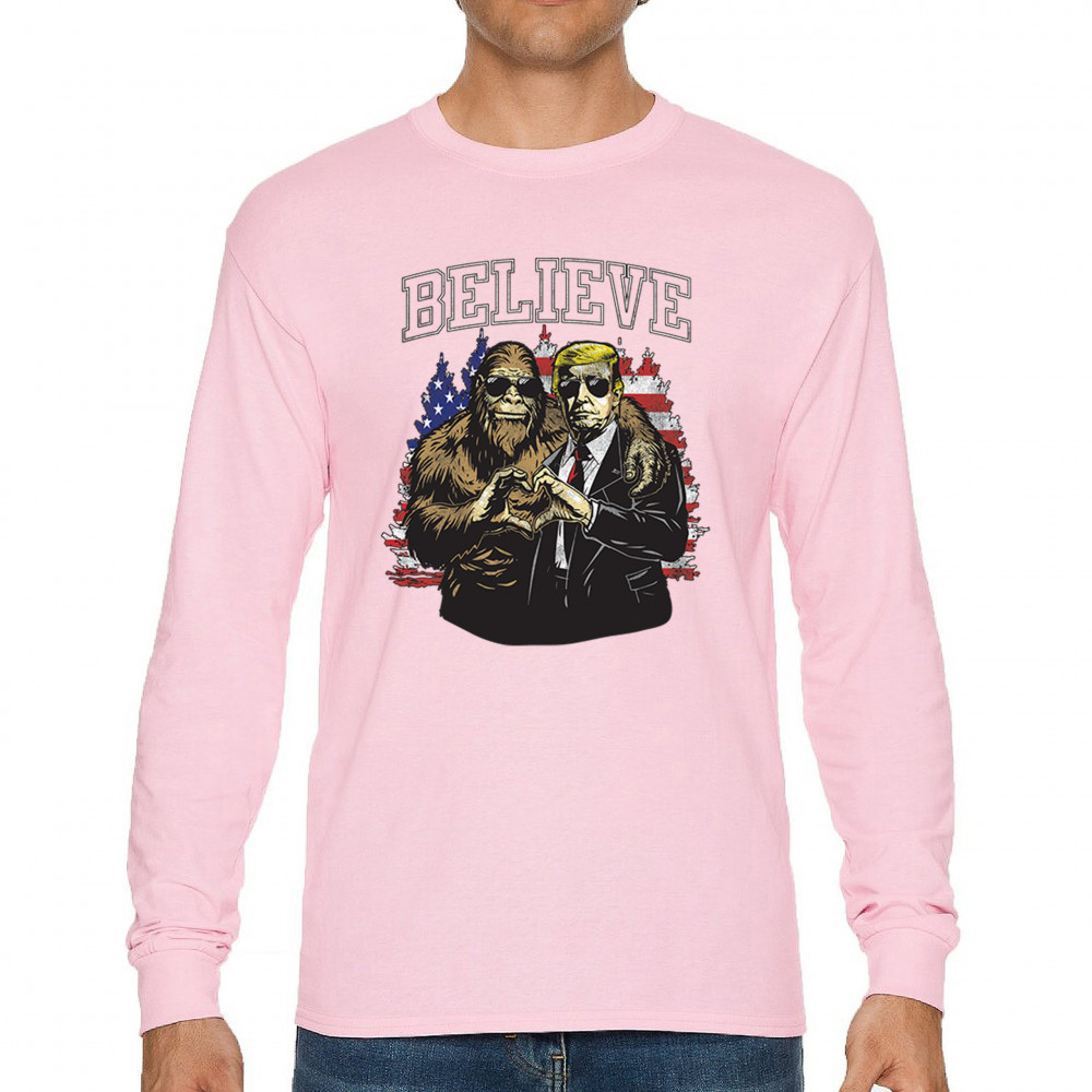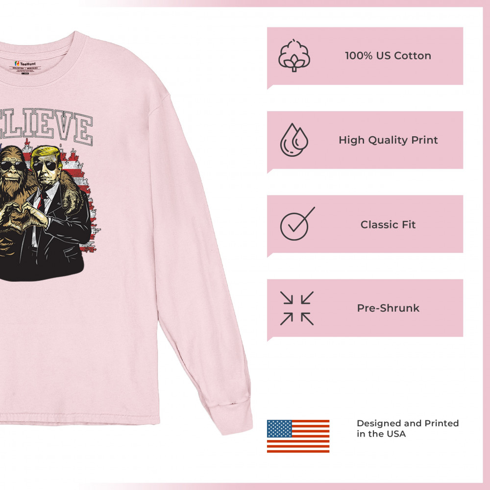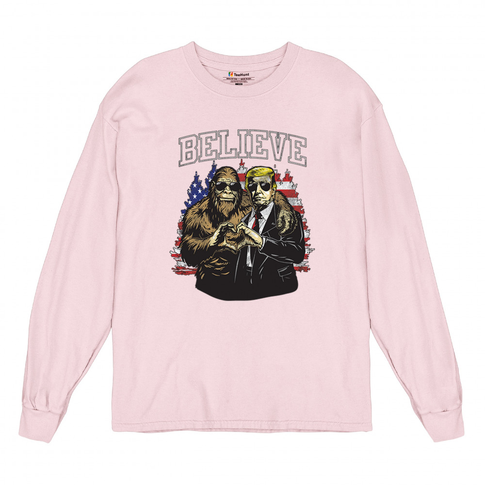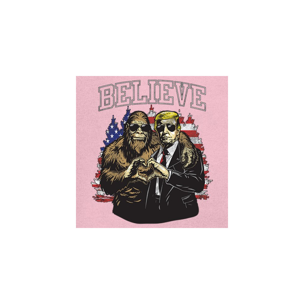 The "Believe" design combines patriotic pride and conservative values with a touch of fun. Featuring Donald J. Trump and a loyal Bigfoot against the American flag, this graphic is perfect for Trump supporters, Republicans, and believers in America First. Celebrate the Red Wave, the 47th President, and the unstoppable fight for victory. Ideal for anyone with unwavering belief in the people's mandate.