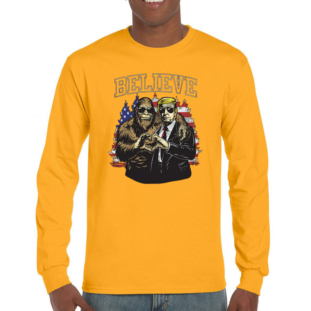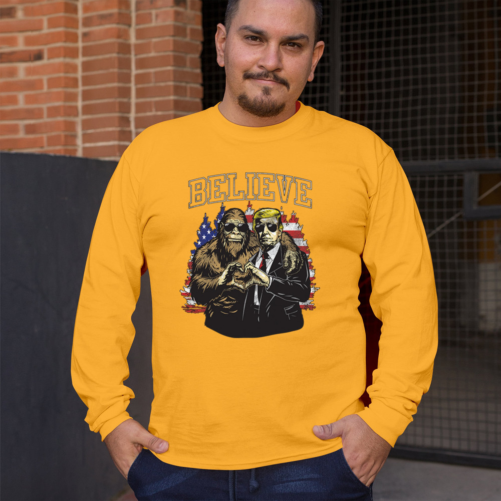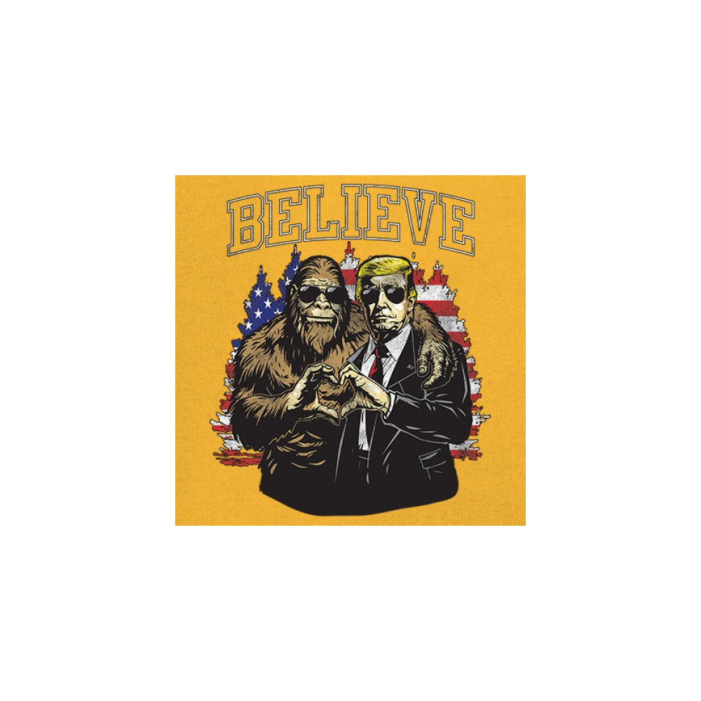 The "Believe" design combines patriotic pride and conservative values with a touch of fun. Featuring Donald J. Trump and a loyal Bigfoot against the American flag, this graphic is perfect for Trump supporters, Republicans, and believers in America First. Celebrate the Red Wave, the 47th President, and the unstoppable fight for victory. Ideal for anyone with unwavering belief in the people's mandate.