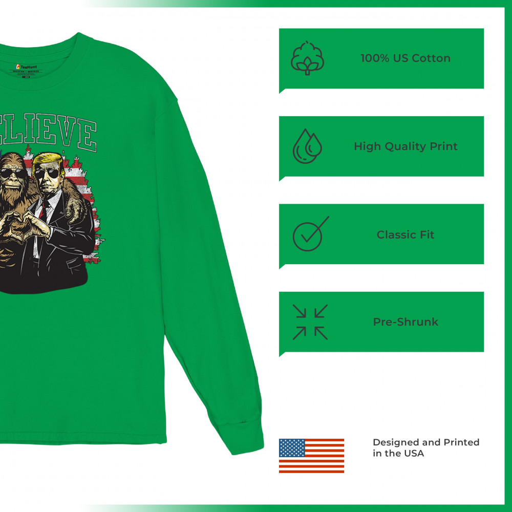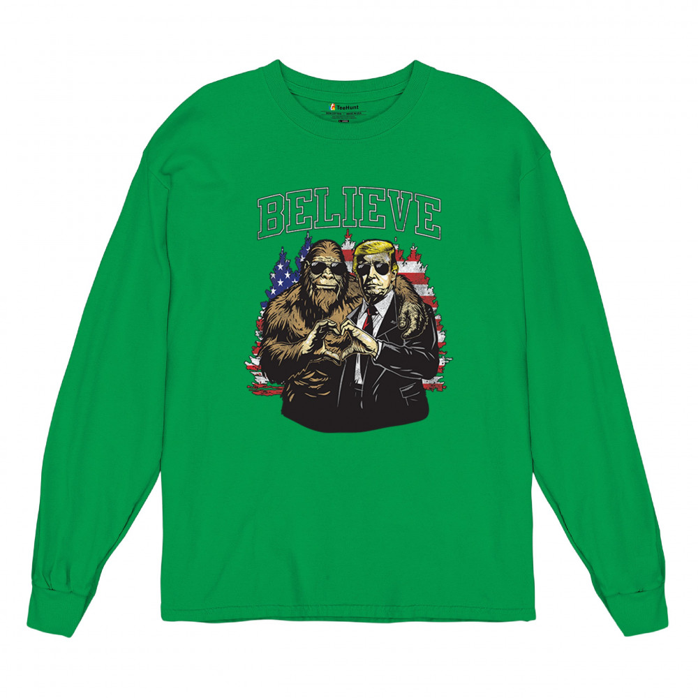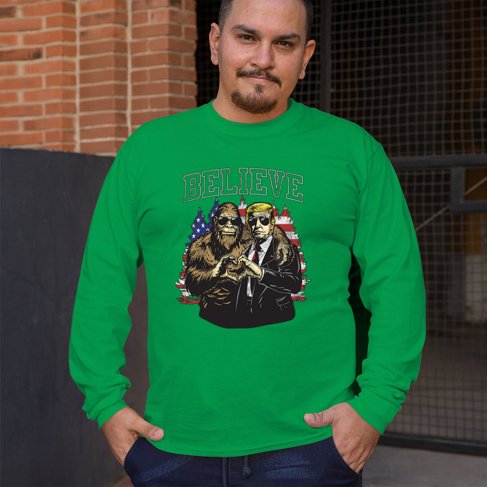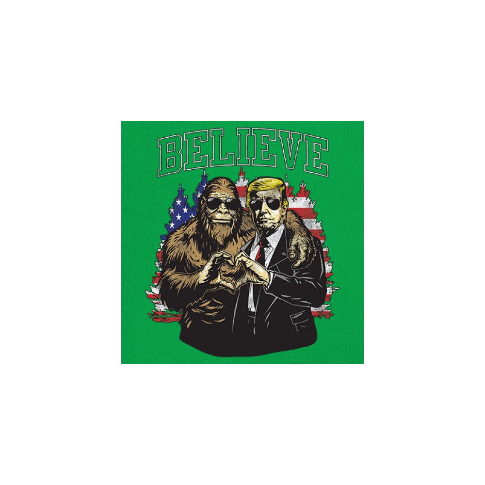 The "Believe" design combines patriotic pride and conservative values with a touch of fun. Featuring Donald J. Trump and a loyal Bigfoot against the American flag, this graphic is perfect for Trump supporters, Republicans, and believers in America First. Celebrate the Red Wave, the 47th President, and the unstoppable fight for victory. Ideal for anyone with unwavering belief in the people's mandate.