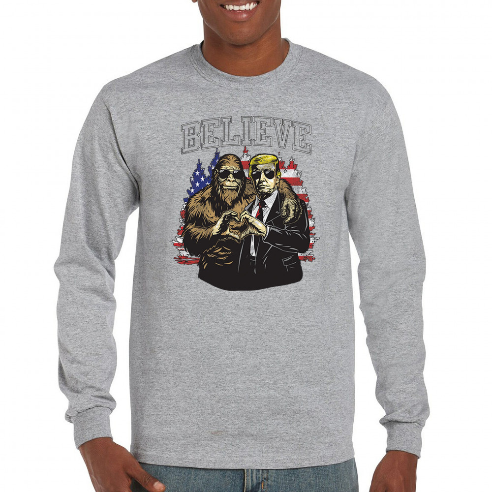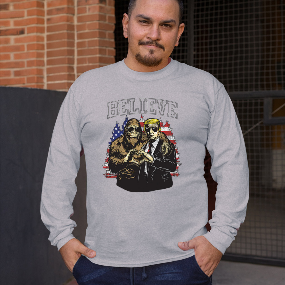 The "Believe" design combines patriotic pride and conservative values with a touch of fun. Featuring Donald J. Trump and a loyal Bigfoot against the American flag, this graphic is perfect for Trump supporters, Republicans, and believers in America First. Celebrate the Red Wave, the 47th President, and the unstoppable fight for victory. Ideal for anyone with unwavering belief in the people's mandate.