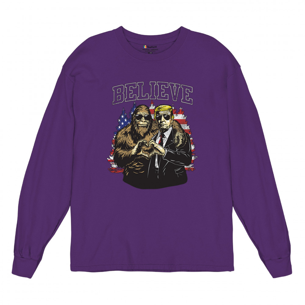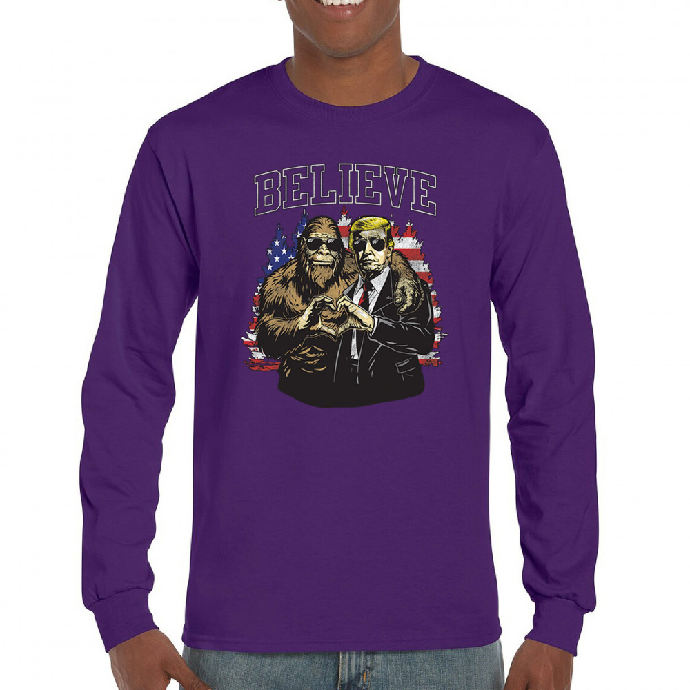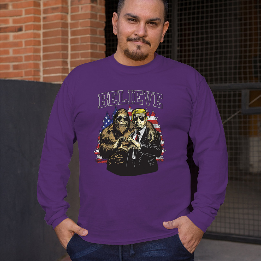 The "Believe" design combines patriotic pride and conservative values with a touch of fun. Featuring Donald J. Trump and a loyal Bigfoot against the American flag, this graphic is perfect for Trump supporters, Republicans, and believers in America First. Celebrate the Red Wave, the 47th President, and the unstoppable fight for victory. Ideal for anyone with unwavering belief in the people's mandate.